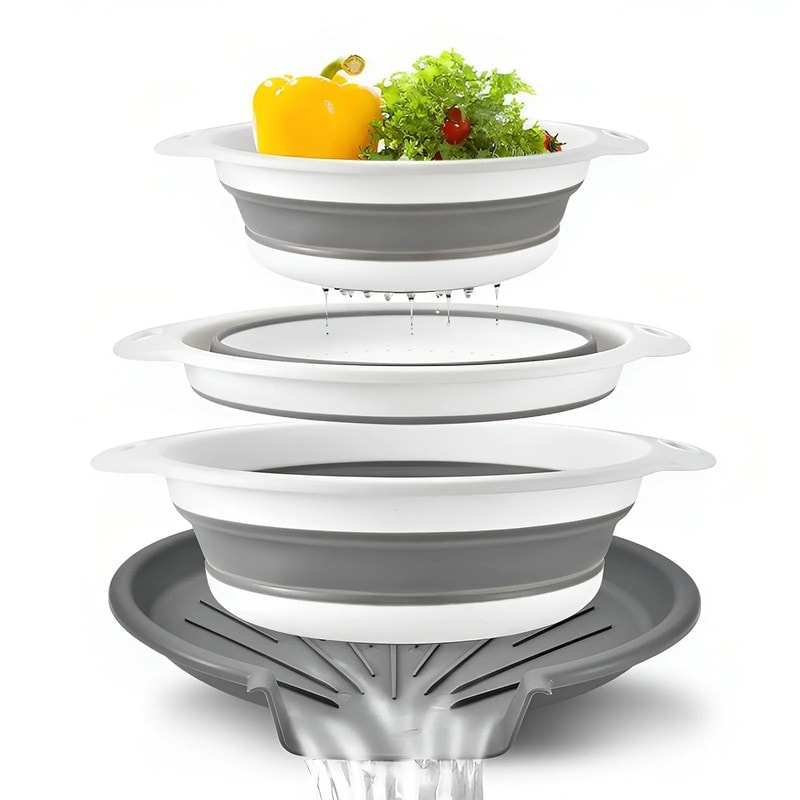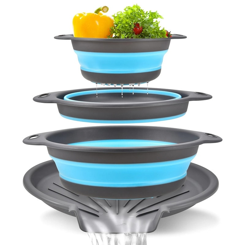 Collapsible Colanders (3 Pack Set) Food Strainers with Over-Sink Water Draining Base
