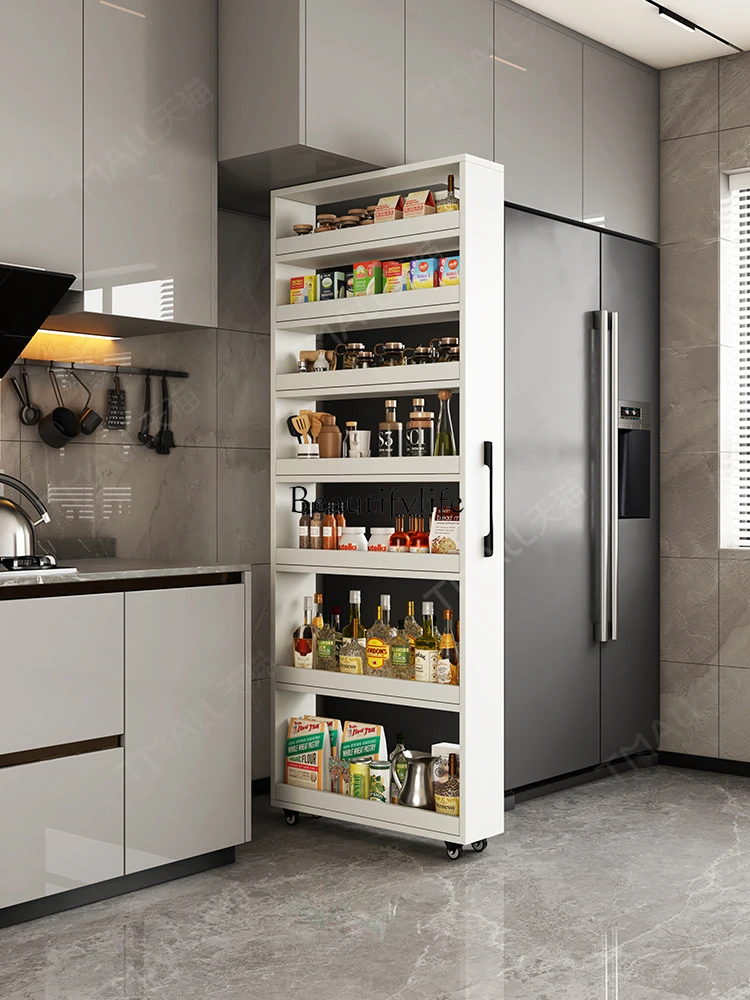 Extremely Narrow Kitchen Storage, Side Pull Cabinet, Refrigerator Gap Sideboard Cabinet, Push And Pull Mobile Storage cream White
