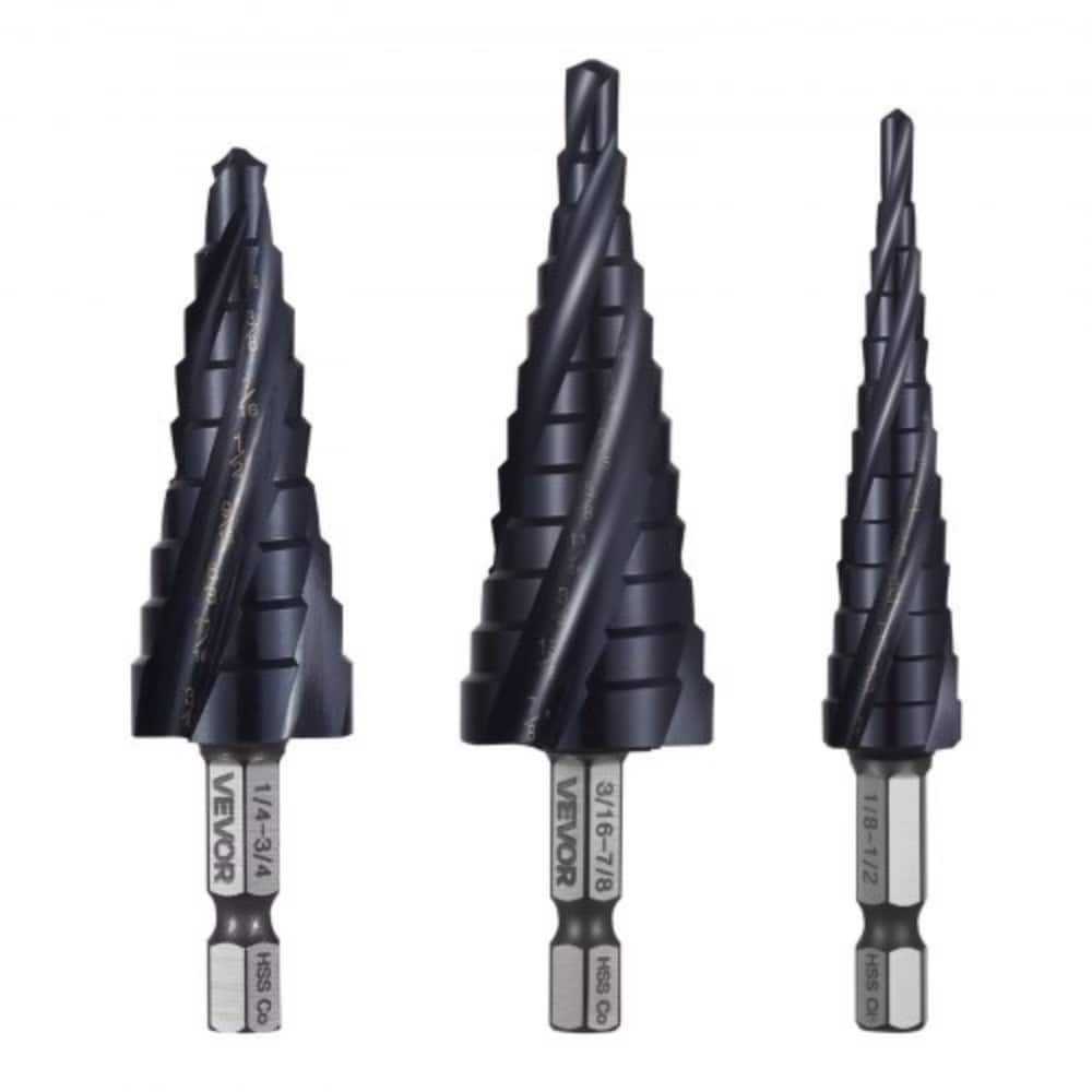3-Piece Step Drill Bit Set with 4-Flute Spiral and Hex Shank TiAlN Coating Fast Chip Removal - 4.65” x 3.94” x 1.38”
