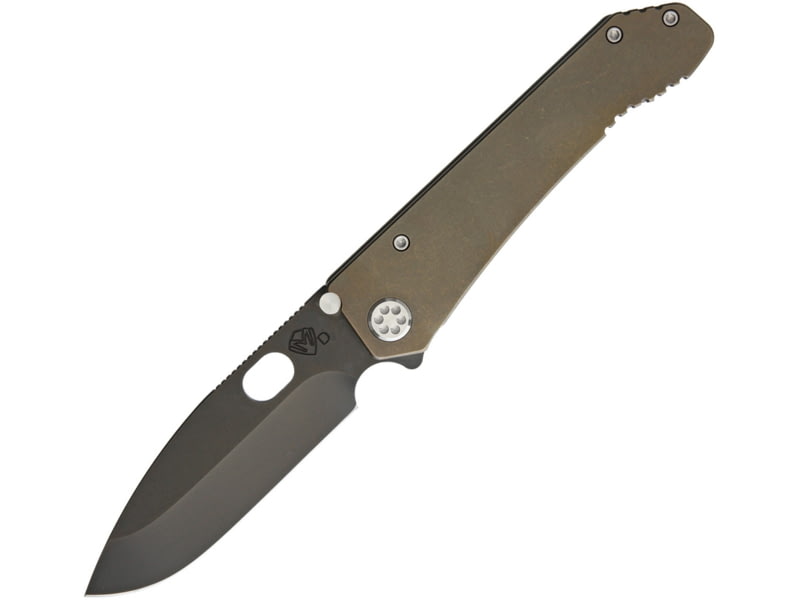 Medford 187 DP Framelock Folding Knife 4in Black Pvd Coated D2 Tool Steel Drop Point Bronze Anodized Titanium Handle OD Green Plastic Storage Case