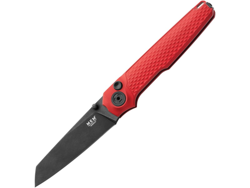 MKM Miura Button Lock Folding Knife 4in Black Stonewash Fnish CPM MagnaCut Stainless Sheepsfoot Blade Red Textured Aluminum Handle. MK MI-ARDB