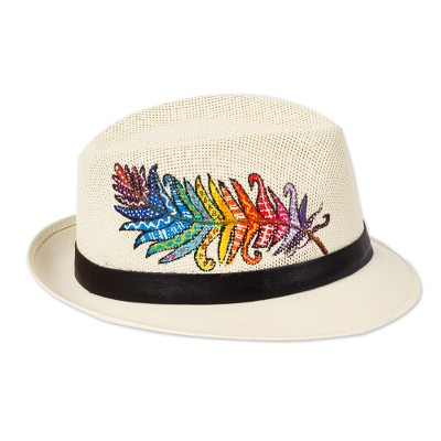 'Hand-Painted Feather-Themed Leather-Accented Cotton Hat'