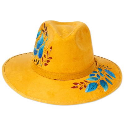 Blue Foliage,'Honey Suede Fedora with Hand-Painted Leaf Motif in Blue'