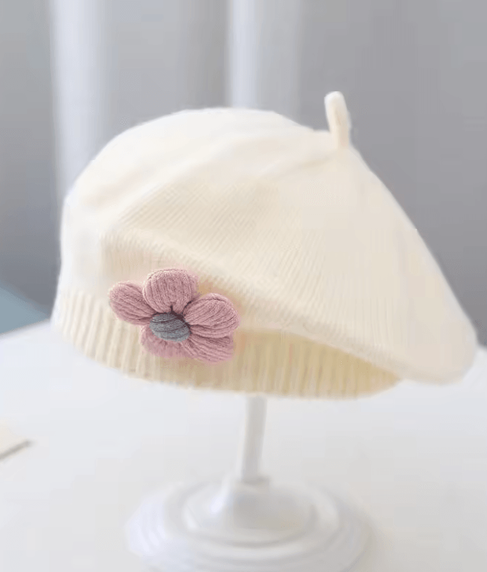 Knitted Baby Beret Hat With Flower Accent Warm Toddler Girl Winter Beanie Cap beige