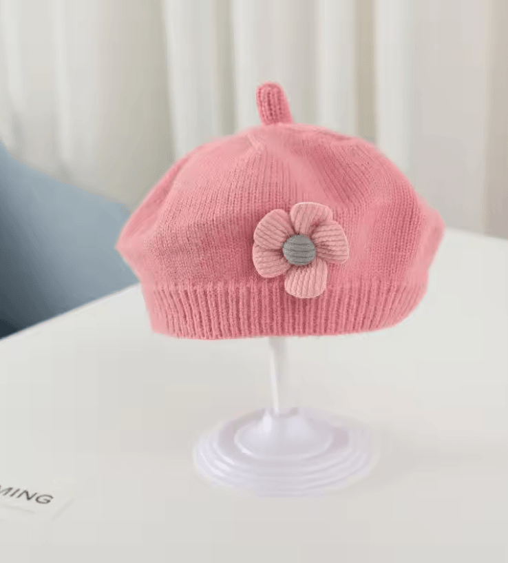 Knitted Baby Beret Hat With Flower Accent Warm Toddler Girl Winter Beanie Cap pink