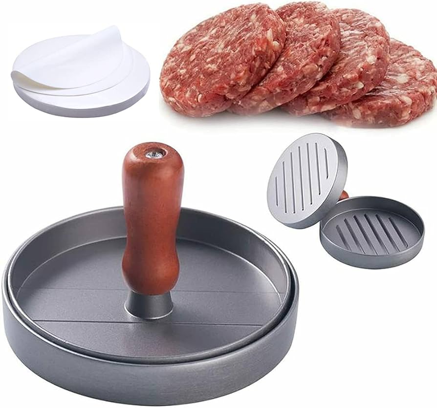 GrillMaster Aluminum Burger Press Non Stick Hamburger Patty Maker With Wax Paper For BBQ & Kitchen Use brown 1 Grid