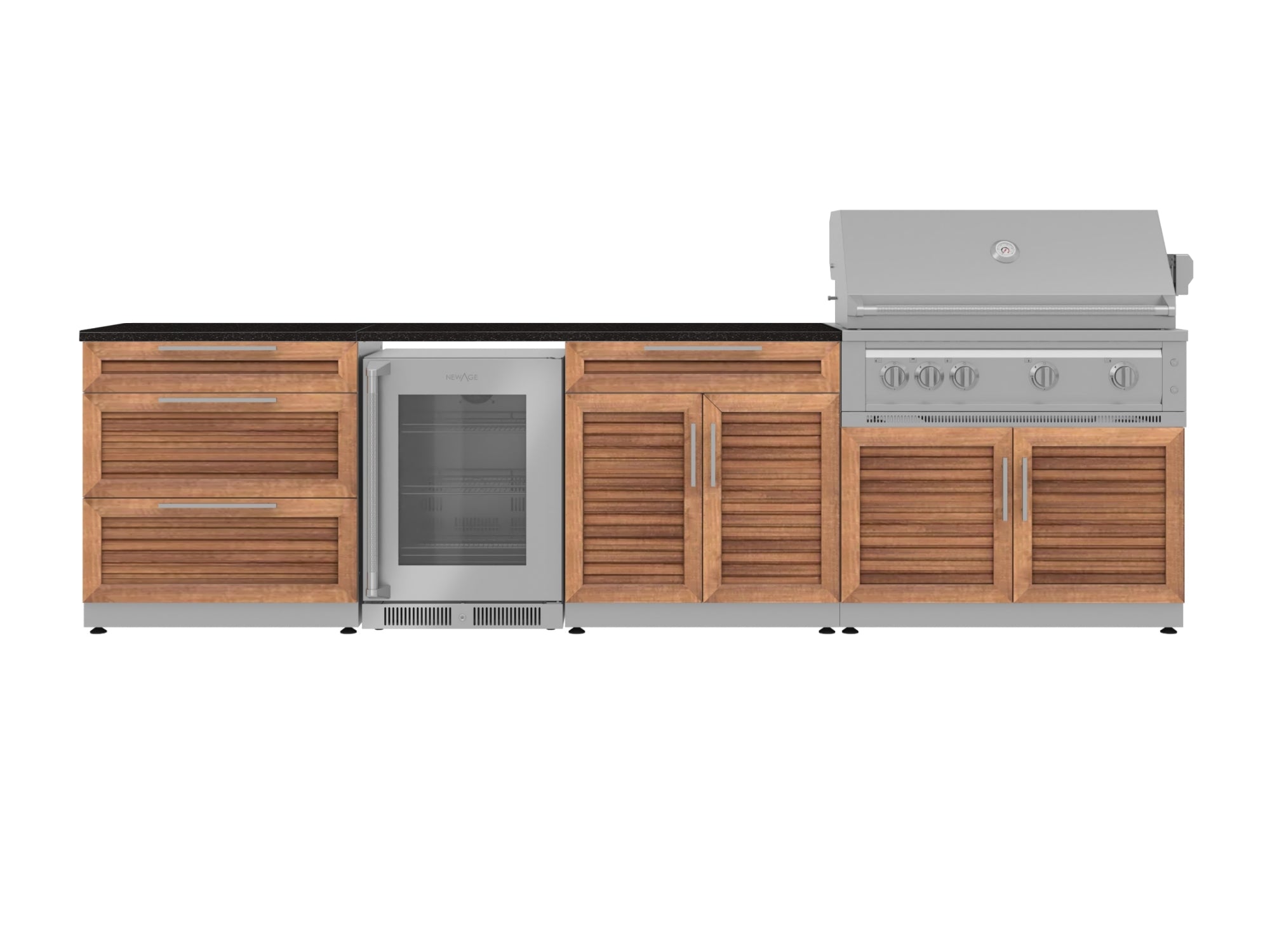 NewAge Outdoor Kitchens Stainless Steel 7-Piece Cabinet Set with 3-Drawer, Bar, Grill Cabinet, Platinum Grill, Countertops and Fridge