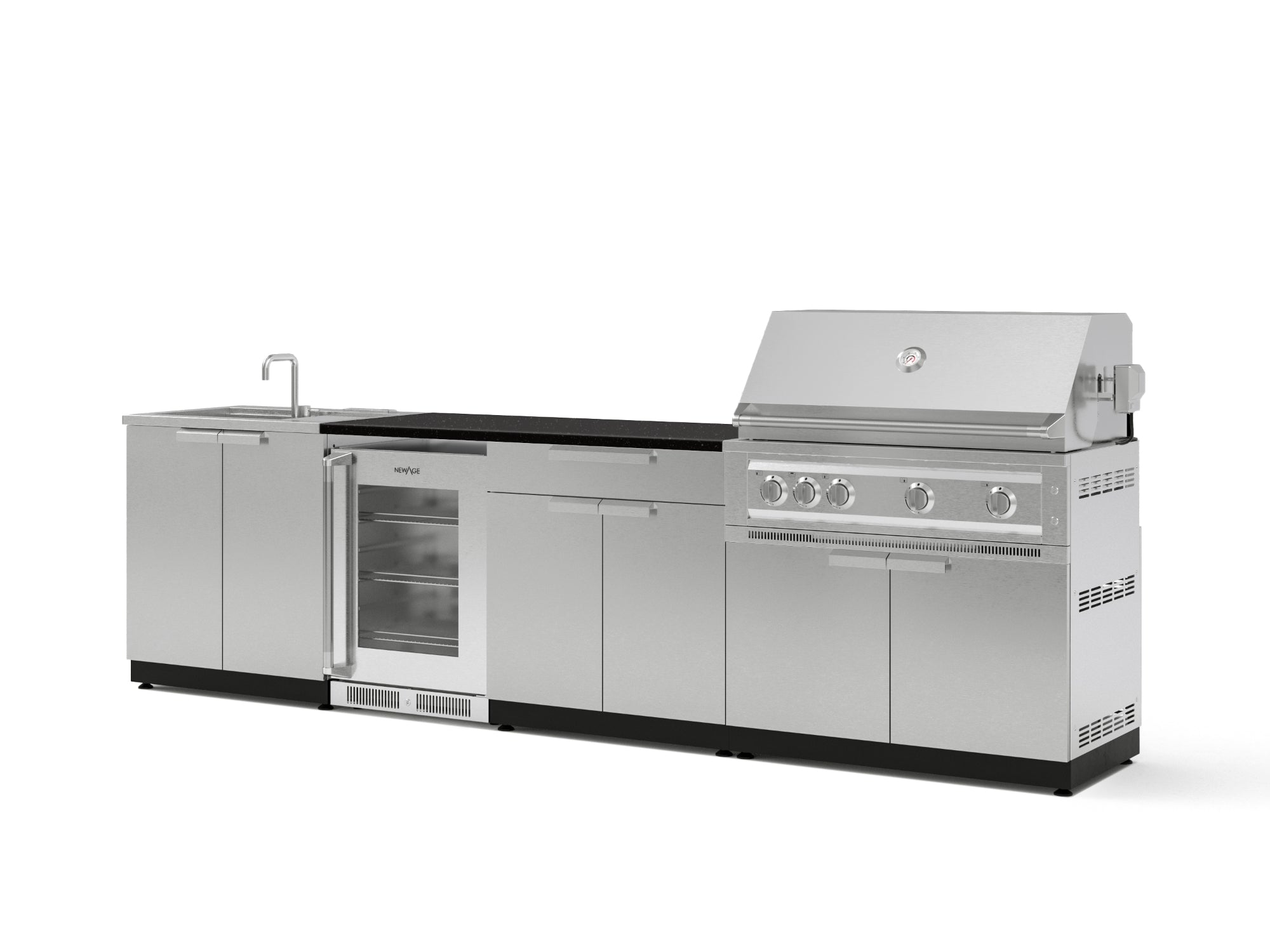 NewAge Outdoor Kitchens Stainless Steel 6-Piece Cabinet Set with Sink, Bar, Grill Cabinet, Platinum Grill, Countertop and Fridge