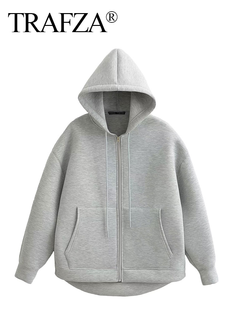 TRAFZA Women's Autumn Jacket, Oversized Gray Hooded Coat, Casual Long Sleeve Zipper Outerwear With Big Pockets dark Grey m