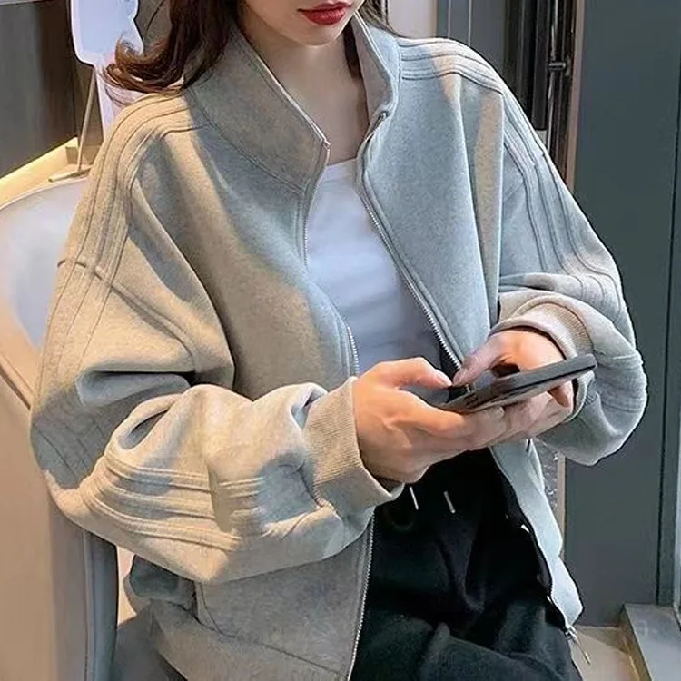 Women's Short Sweatshirt Jacket, Versatile Loose Fit Casual Style, Three Stripe Autumn Winter Jacket l gray