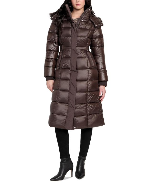 Faux-fur Trim Hooded Maxi Puffer Coat - Brown - Guess Coats