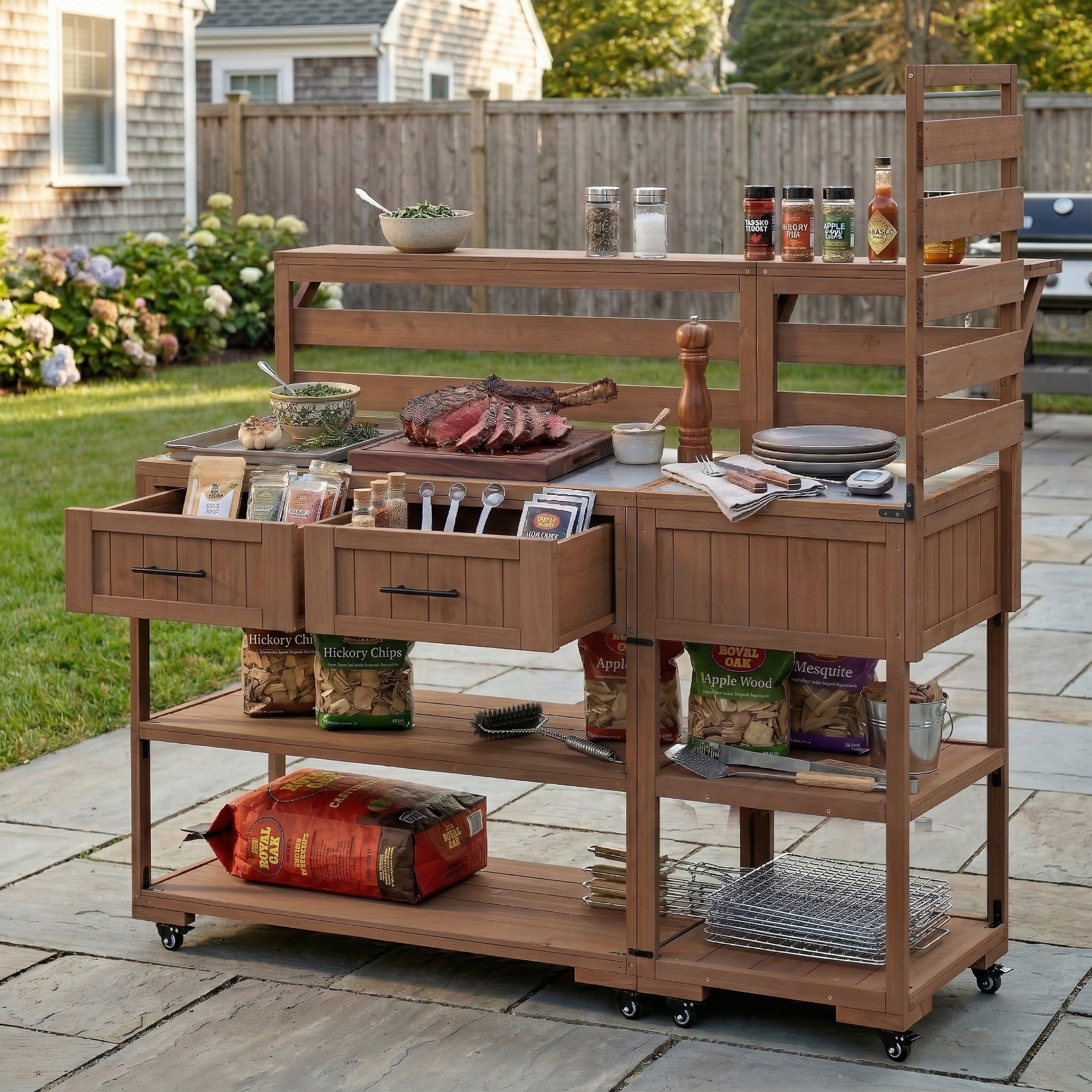62.3"Patio Kitchen Island Solid Wood Kitchen Cart with Stainless Table Top, Garden Potting Bench with Raised Shelf and Drawers