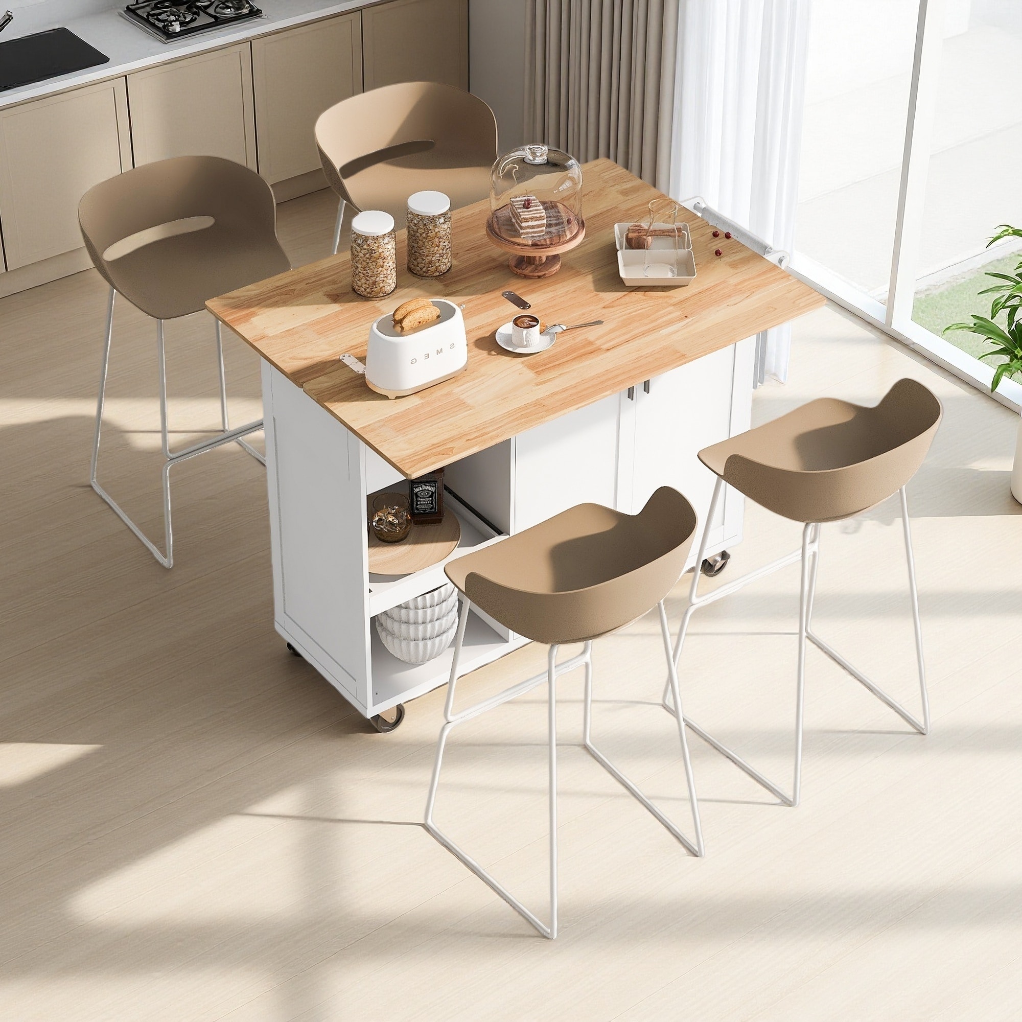 Kitchen Island Cart with Wood Top, Portable Kitchen Storage, Modern Kitchen Furniture, White & Natural Finish