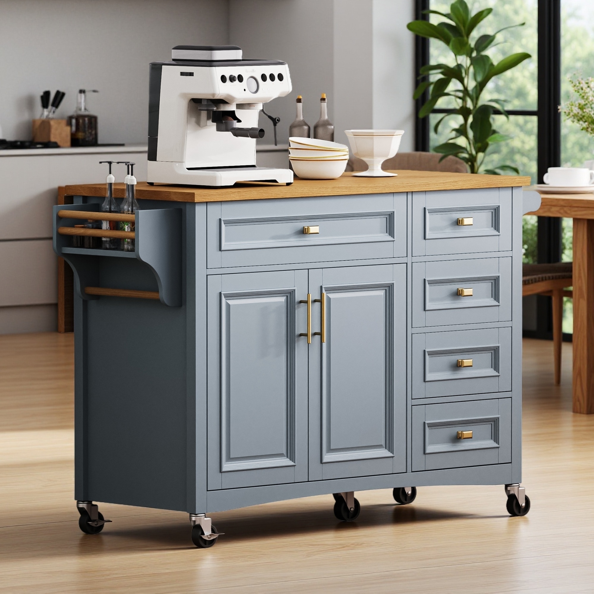 Kitchen Cart with Storage - Butcher Block Top, Spice Rack, Trash Compartment, Mobile Island