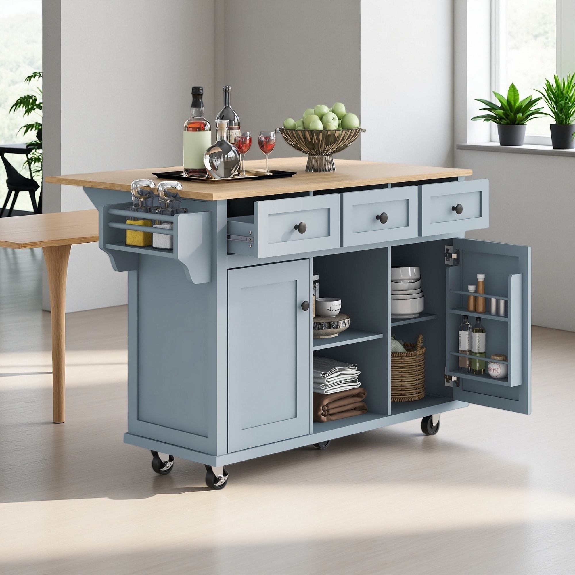 Kitchen Cart with Rubber Wood Drop-Leaf Countertop, Storage Cabinet and 3 Drawers