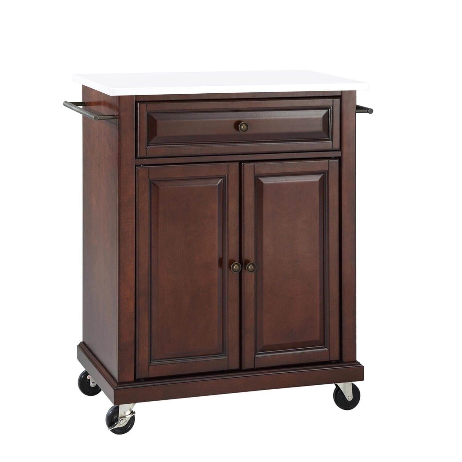 Compact Stone Top Kitchen Cart in Mahogany and White with Adjustable Shelf, Storage Drawer, and Towel Bars - Mahogany/White