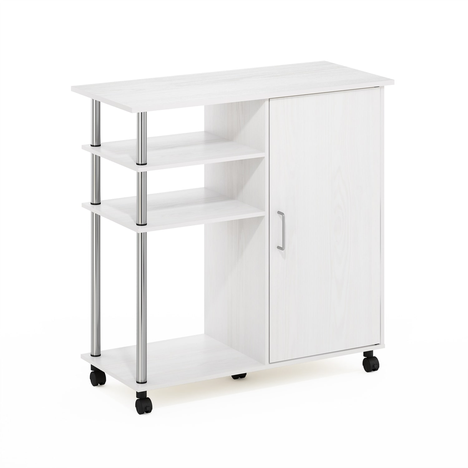 Utility Kitchen Island and Storage Cart with Cabinet, Open Shelves, and Stainless Steel Support Tubes on Wheels