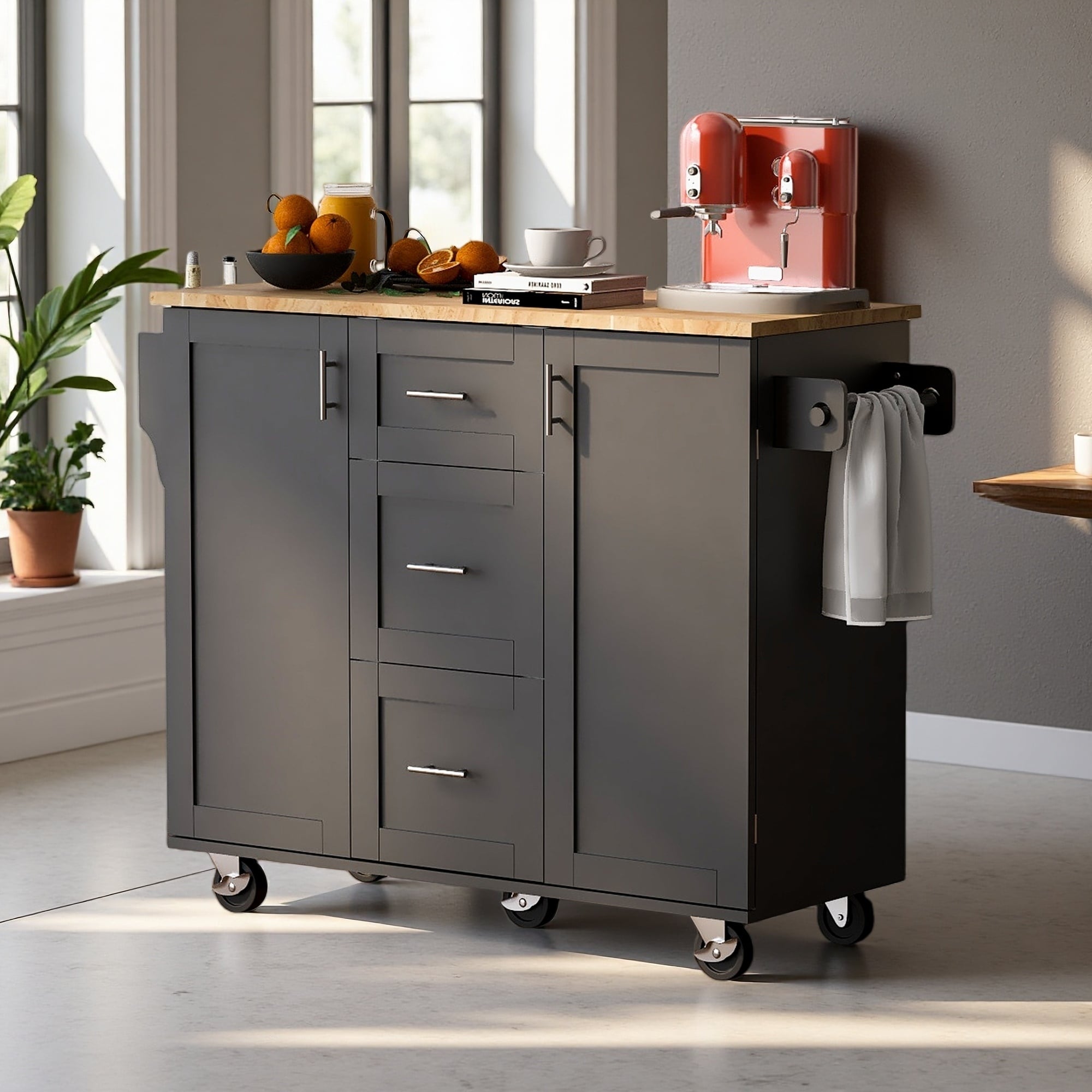 Stylish Rolling Kitchen Island with Solid Wood Top, Towel Rack & Ample Storage