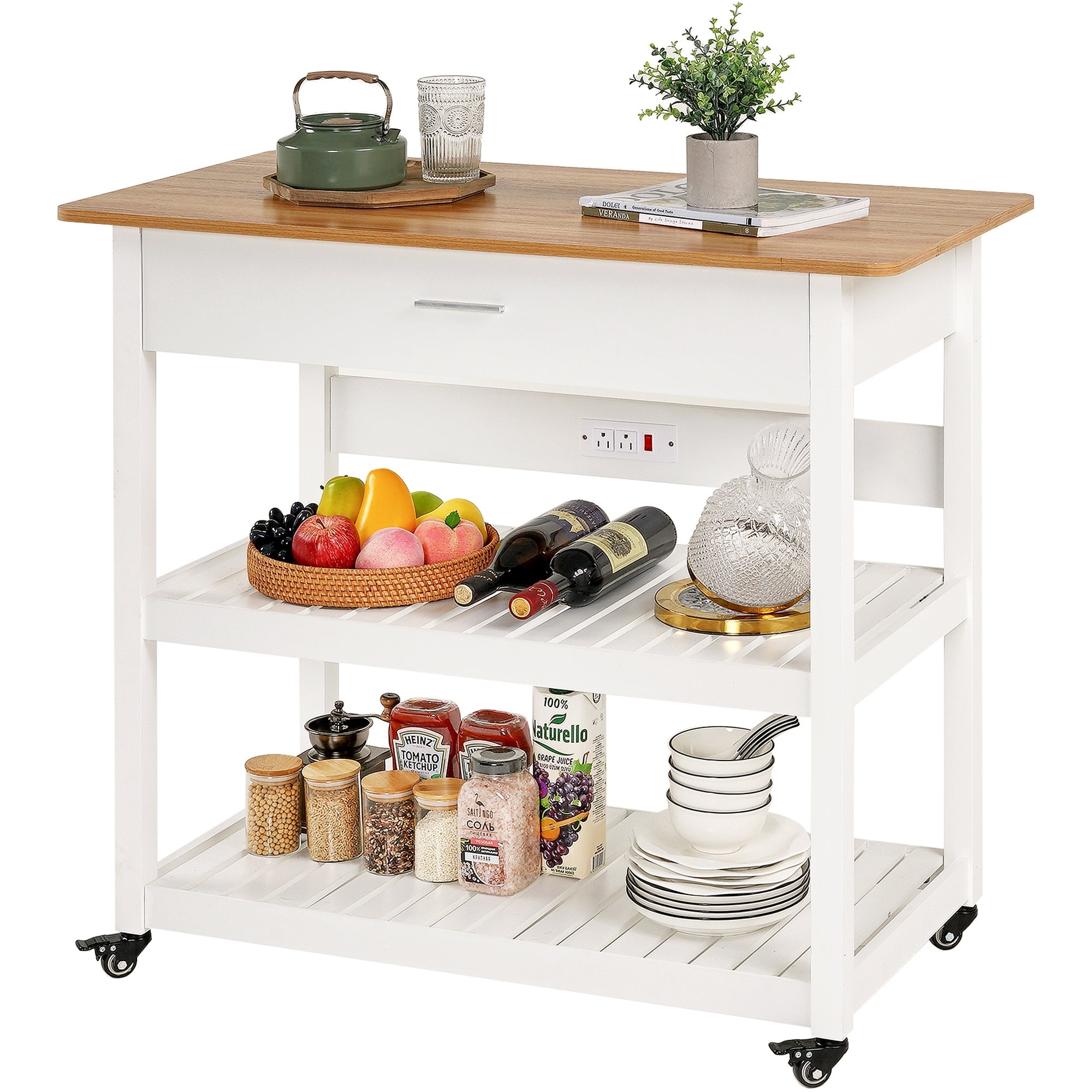 Javlergo Home Kitchen Island with Wood Top 36.6" Width Rolling Kitchen Cart with Drawer and Power Outlet