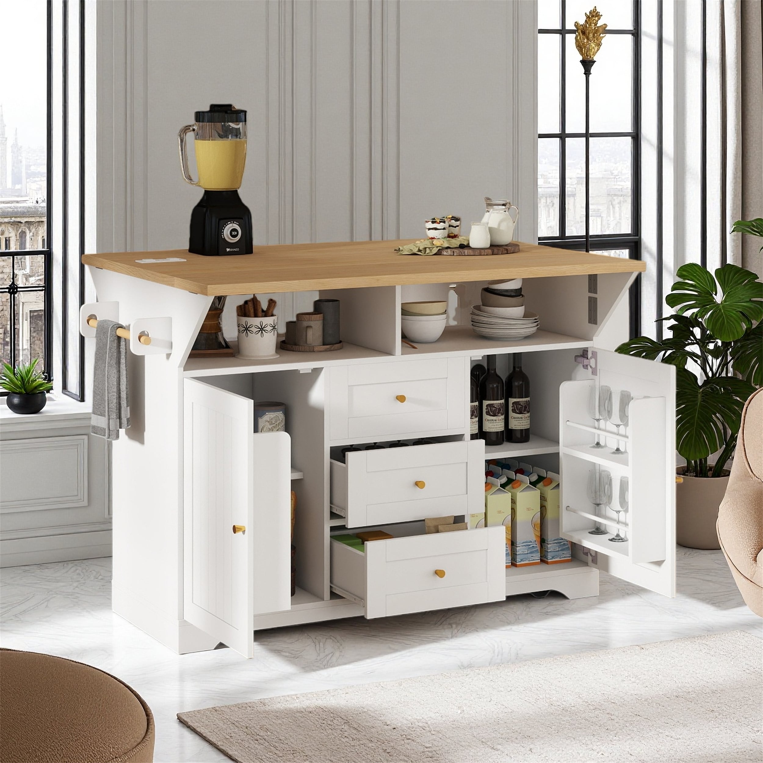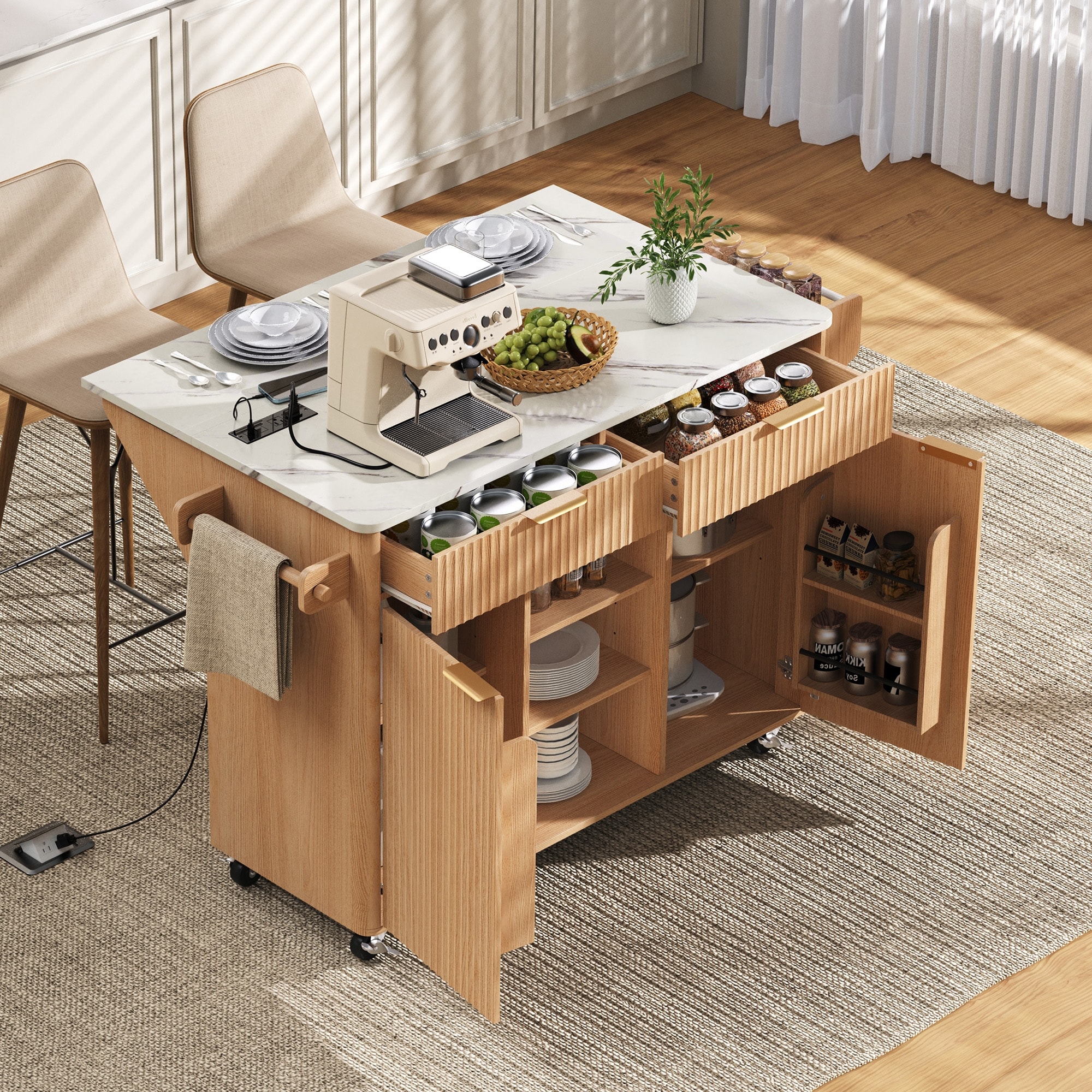 Fluted Kitchen Island with Drop Leaf, Power Outlet & 2 Drawers, Rolling Island Carts with Spice Rack and Towel Rack for Kitchen