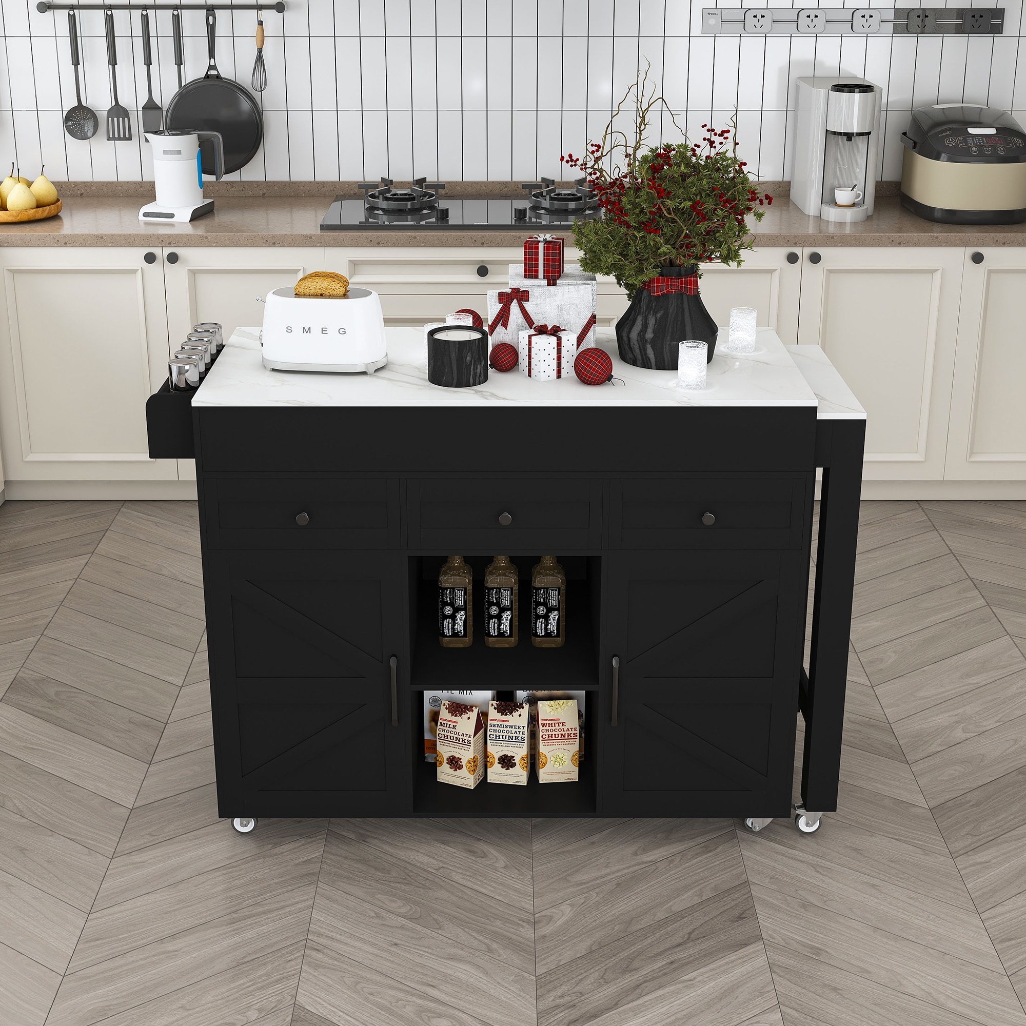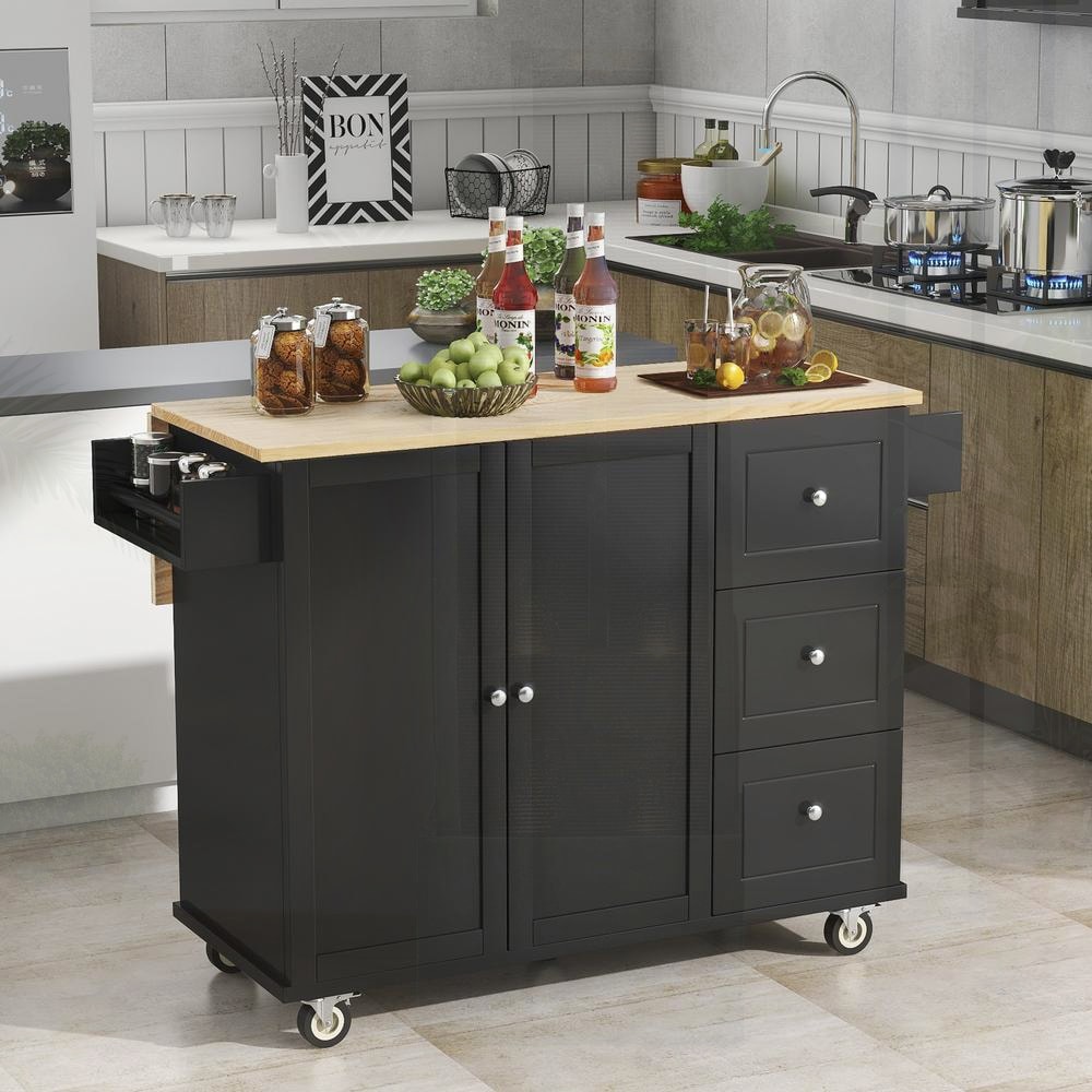 52.7 Inch Rolling Kitchen Island with Wood Top Drop Leaf Storage Black