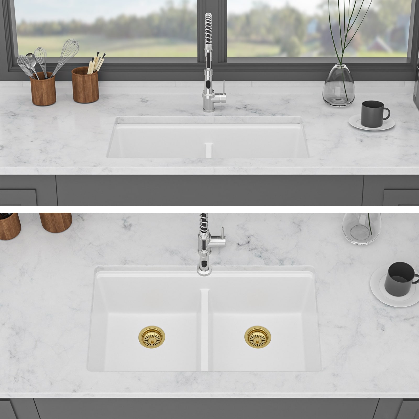 Undermount Double Bowl Quartz Kitchen Sink in White - 33'' x 19'' x 9.65''