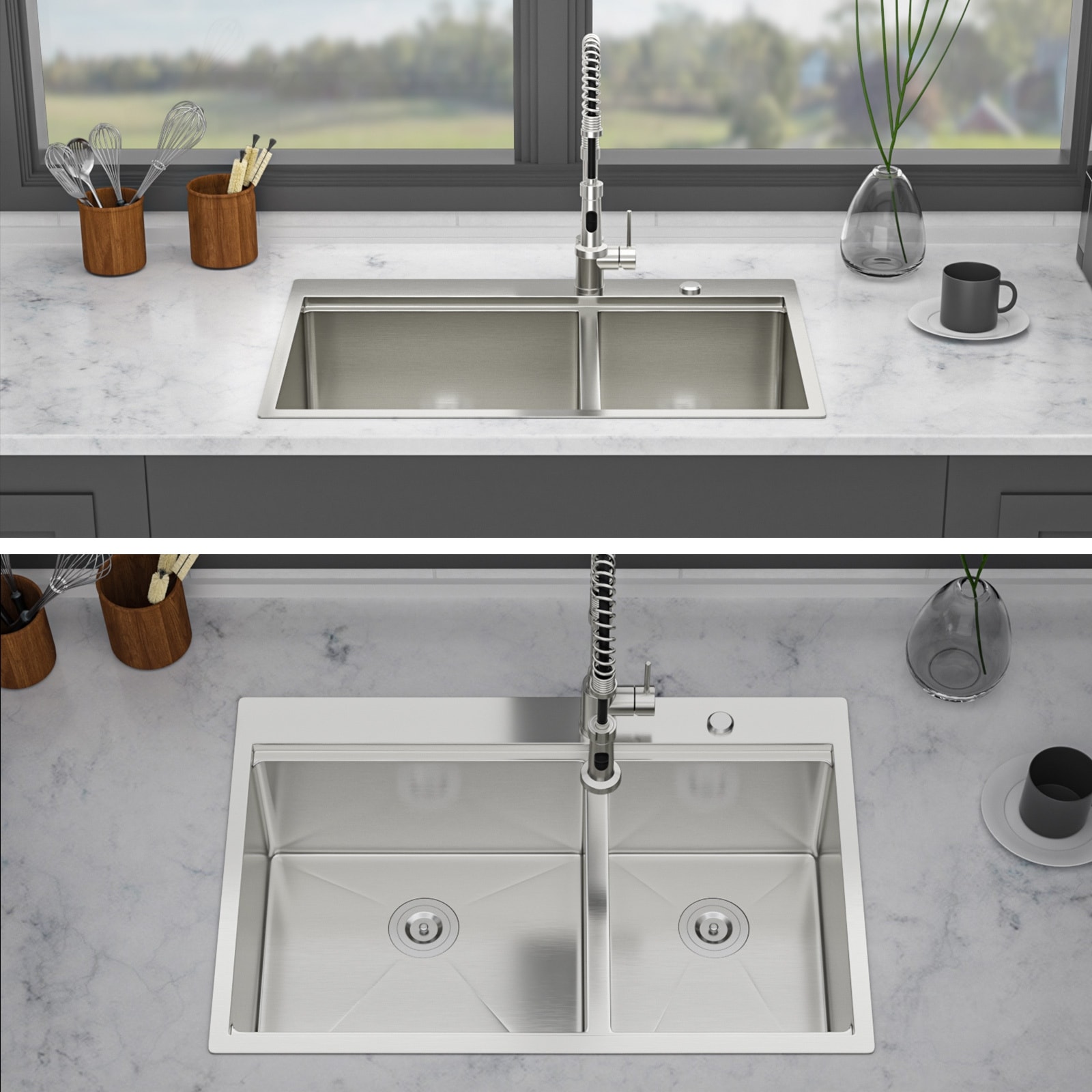 33 Inch Drop-in Double Bowl Quartz Kitchen Sink - 33'' x 22'' x 9.65''