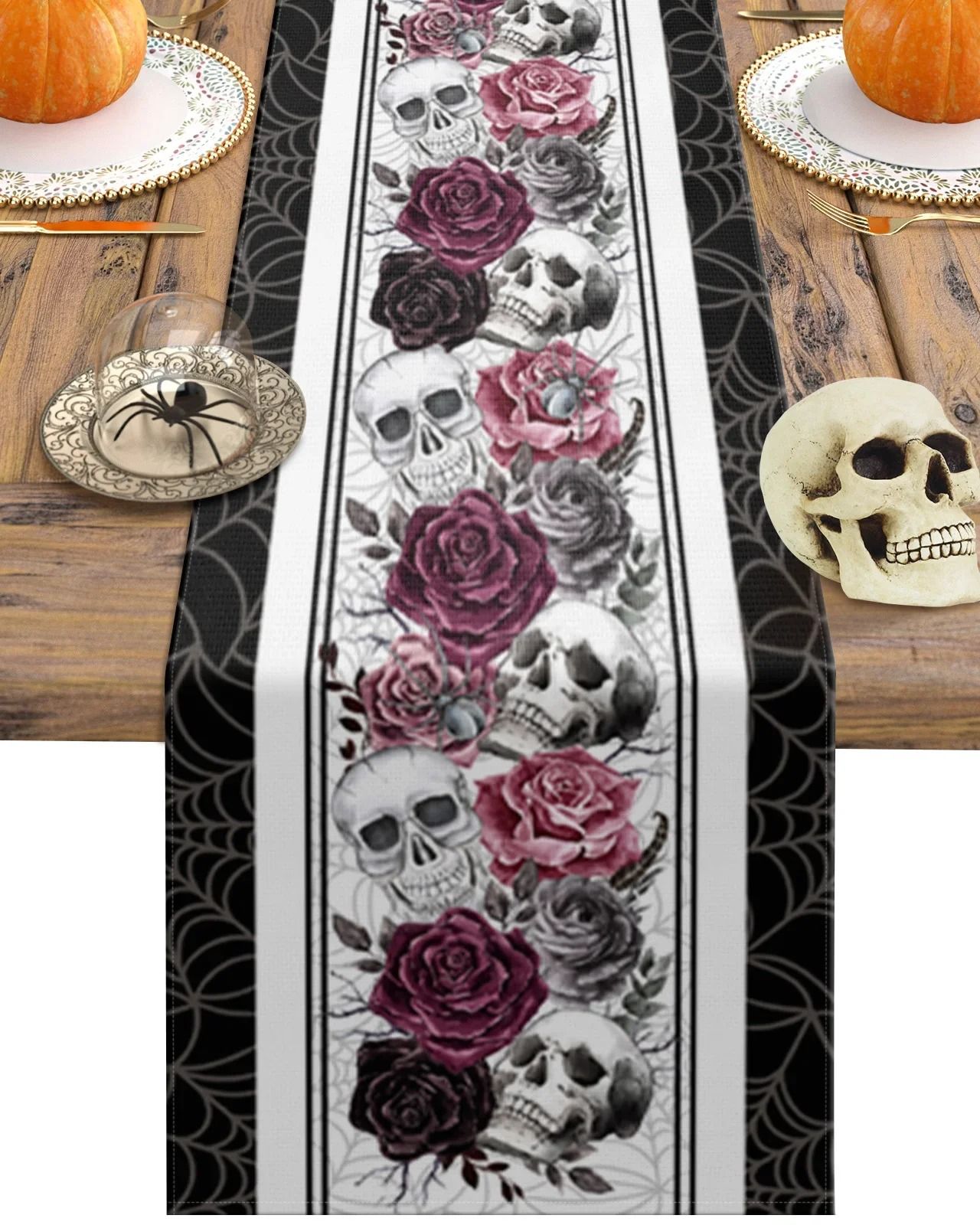 Halloween Skull Rose Crow Linen Table Runner Gothic Party Dining Table Decor 200x33 Cm 79x13 In