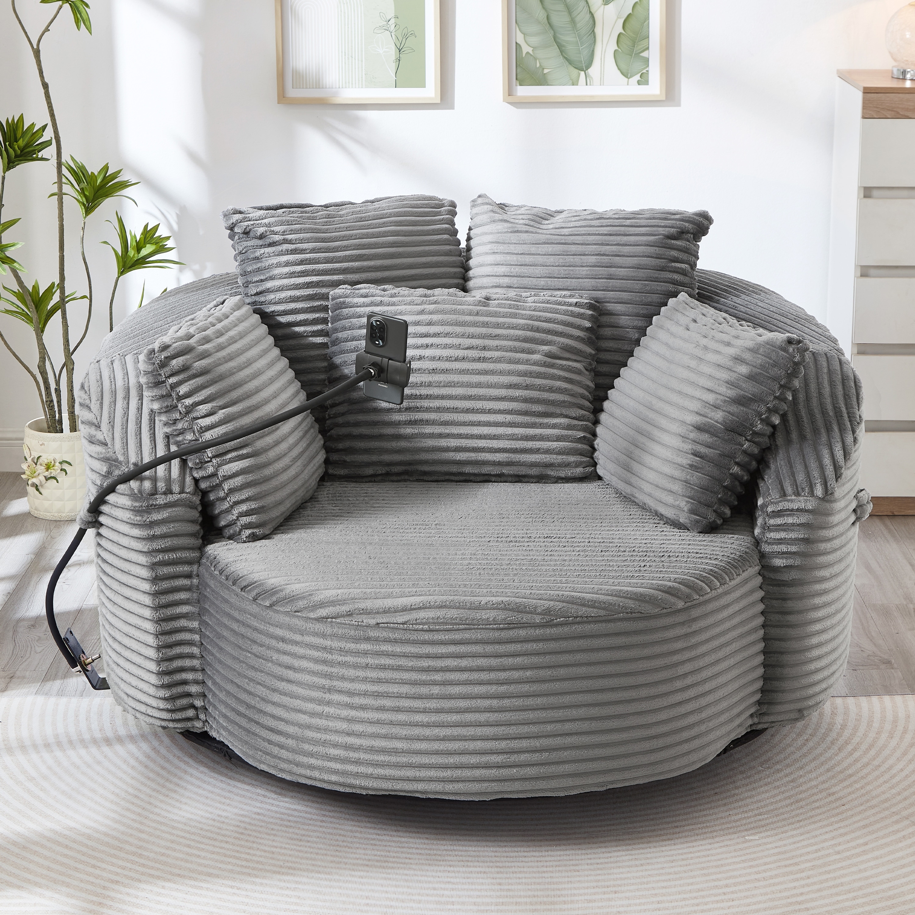 360° Swivel Chair Accent Barrel Chair Corduroy Round Sofa Chair with 5 Throw Pillows and an Adjustable Phone Holder