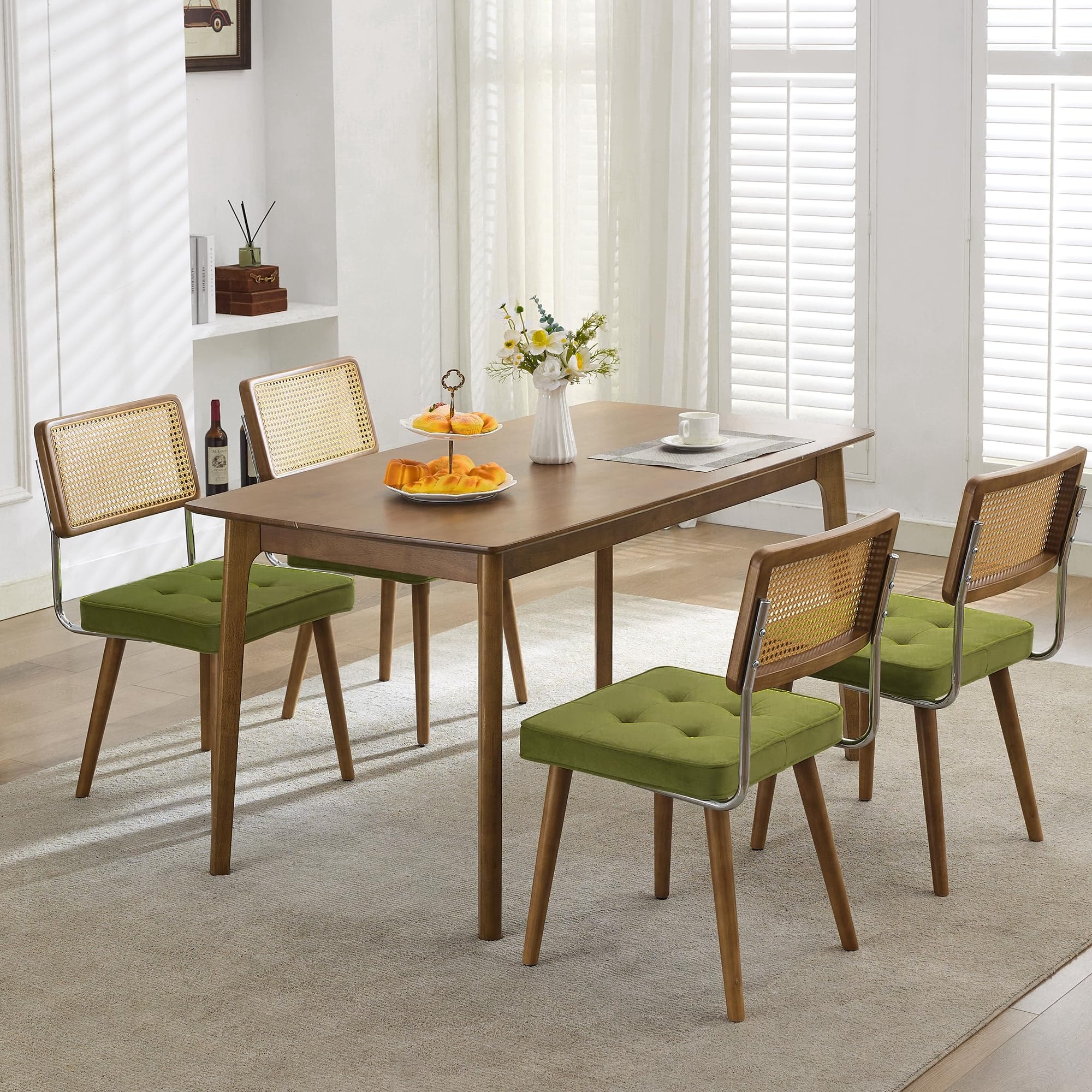 Set of 4 Rattan Dining Chair,Upholstered Boho Wood Legs