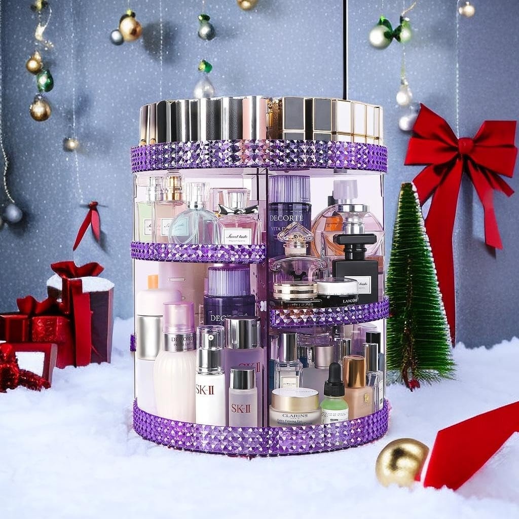 360 Degree Rotation Makeup Organizer Antique Countertop Cosmetic Storage Box Mirror Glass Beauty Display,Spin Large Capacity