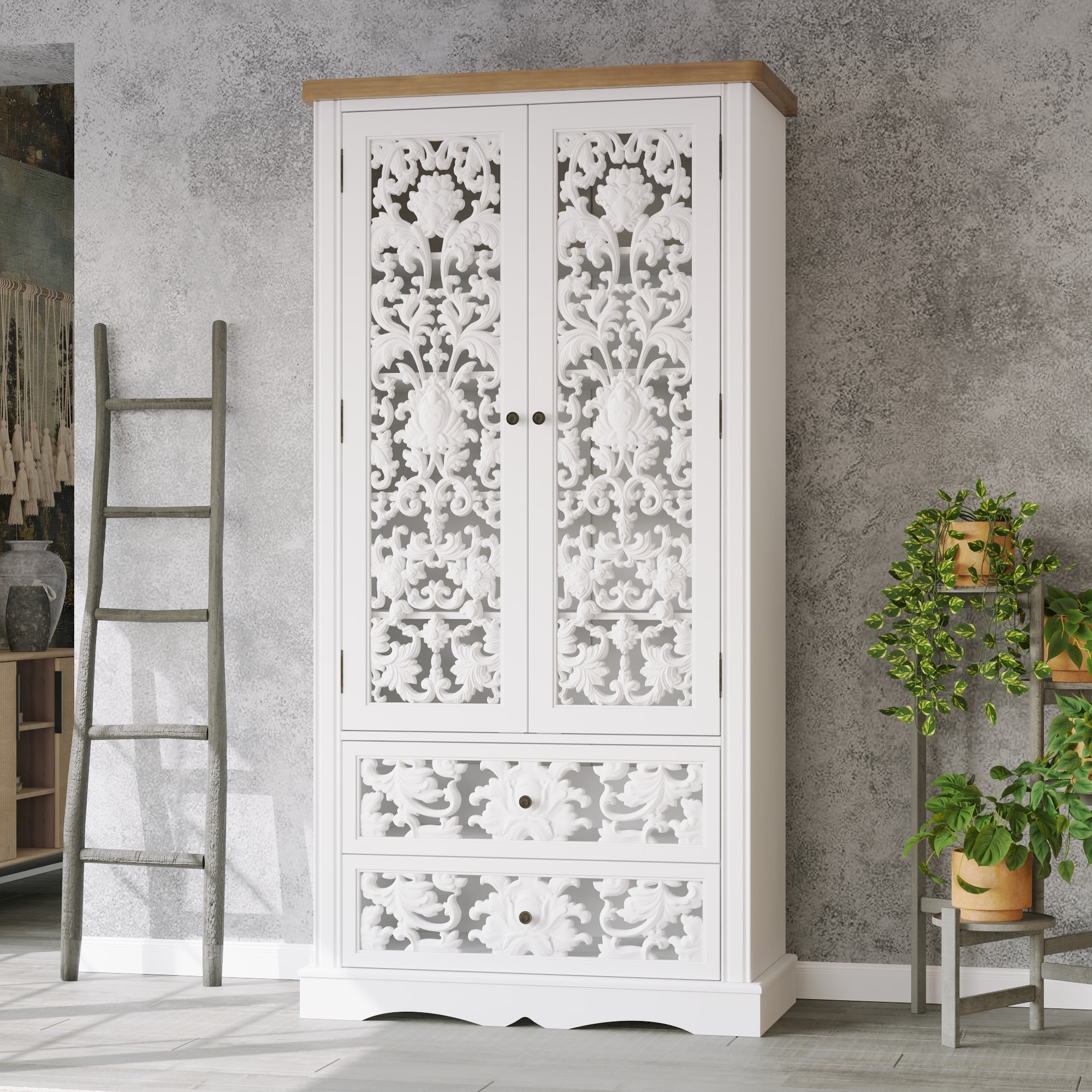 Bookcase Display Cabinet Carved Door Pantry Cabinet with 2 Drawers White Wood Storage Cupboard Bookshelf