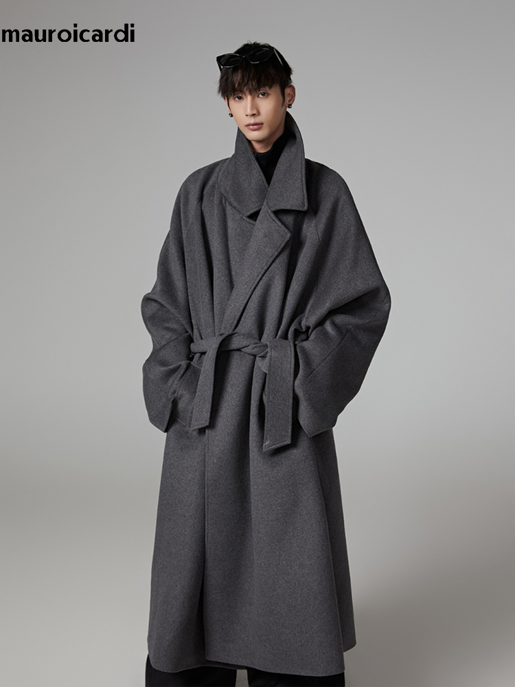 Warm Gray Wool Blends Coat Men Autumn Winter Oversized Extra Long Luxury Woolen Overcoat With Sashes Raglan Sleeve grey l