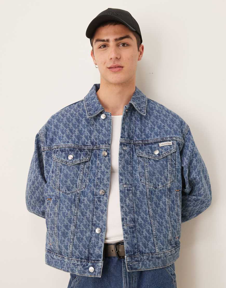 Calvin Klein Jeans 90s all over print denim jacket in mid wash-Blue