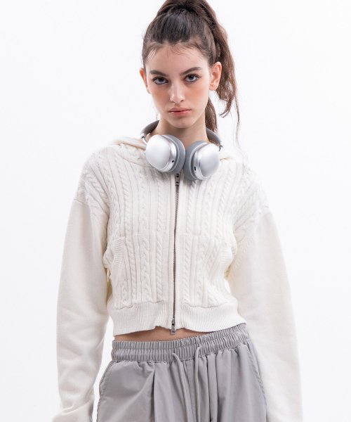 someplace Cable Hood Zip-up Crop Knit Cardigan Jacket Pullover