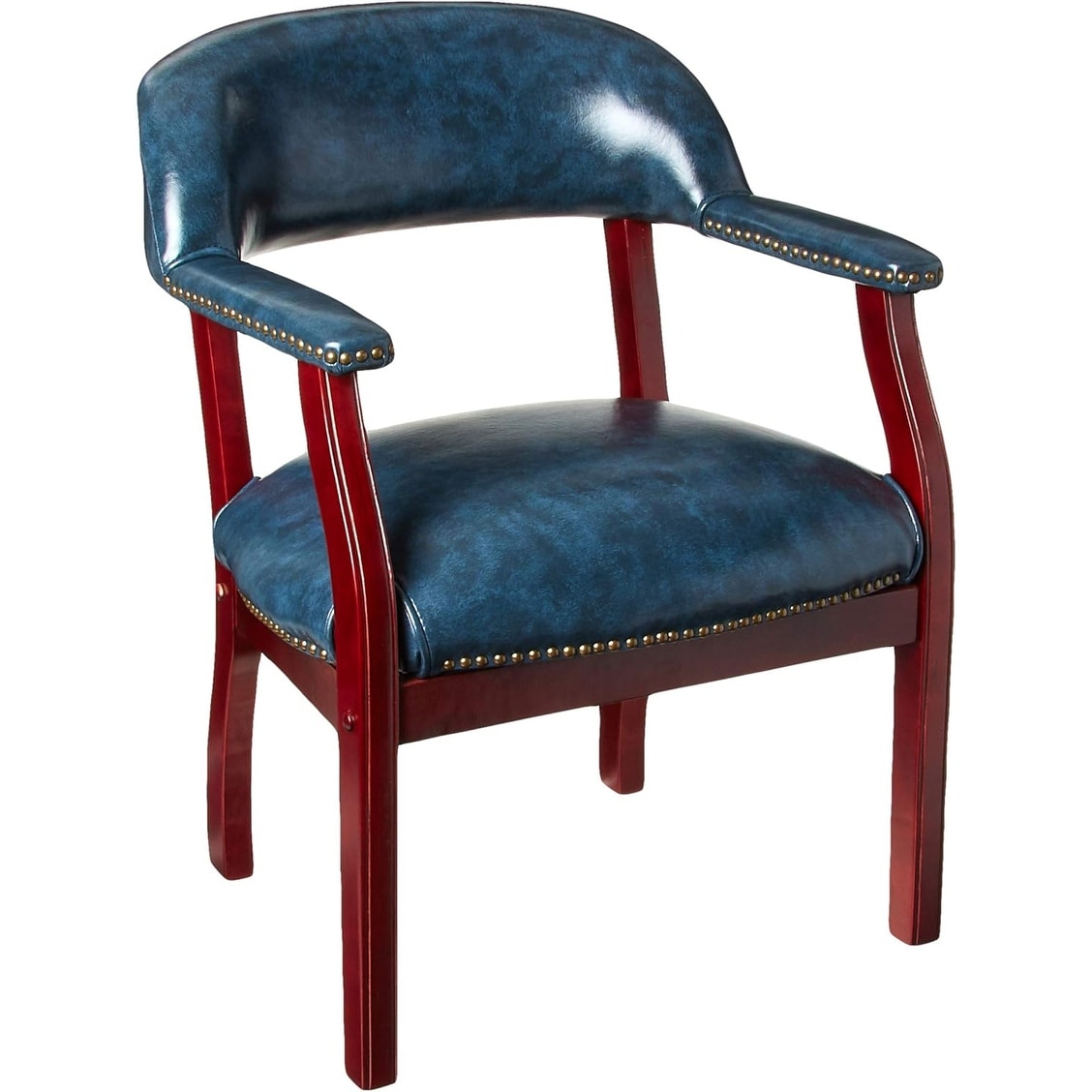 Blue Vinyl Captain's Chair with Brass Nail Trim and Mahogany Finish