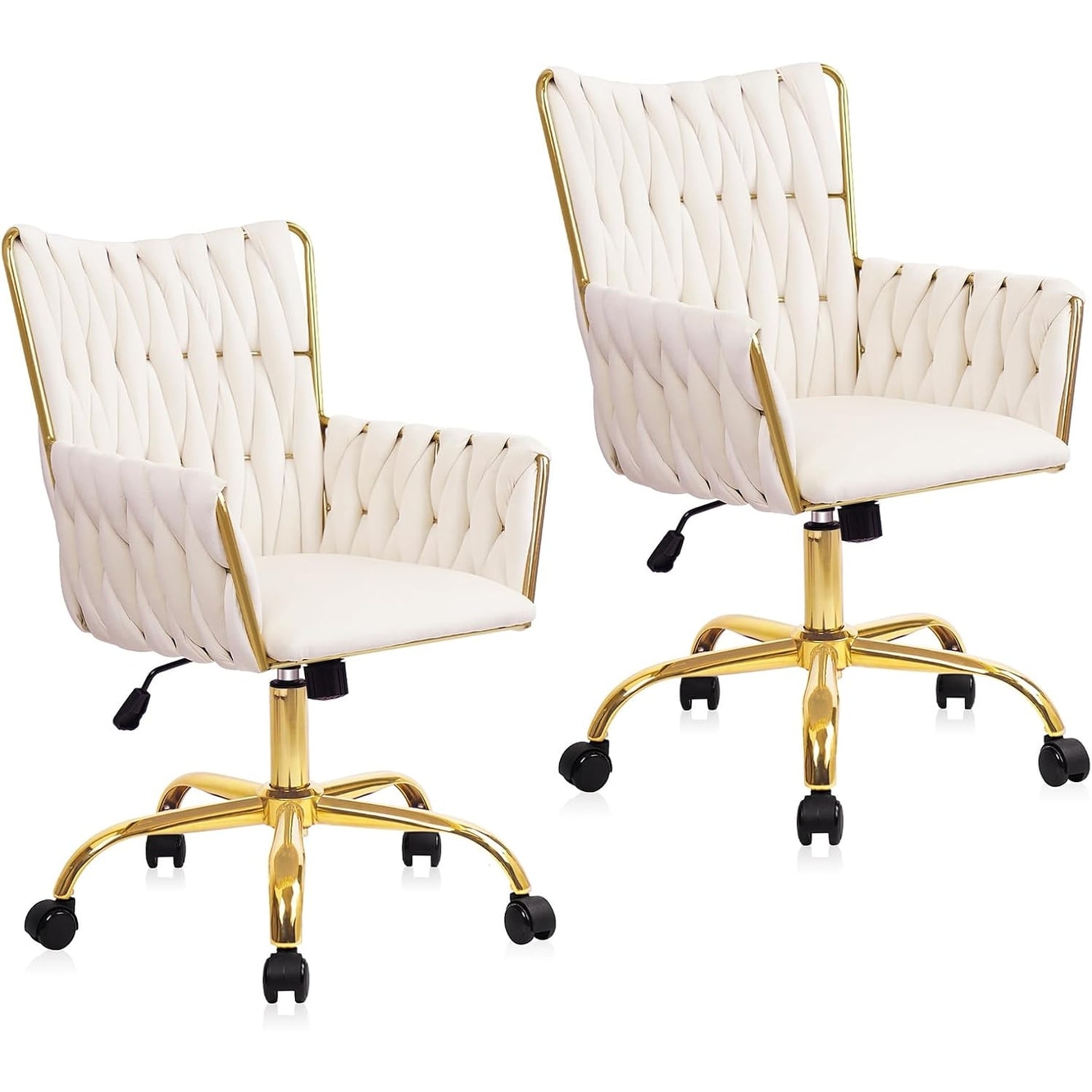 Modern Velvet Swivel Chair with Gold Base, Adjustable Height & Wheels for Home Office, Bedroom - White (2 Pack)