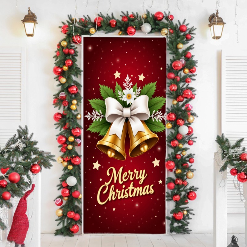 Merry Christmas Door Cover, Bell Garland Door Decor, Dining Table Cover, Elastic Holiday Decoration v 1pcs