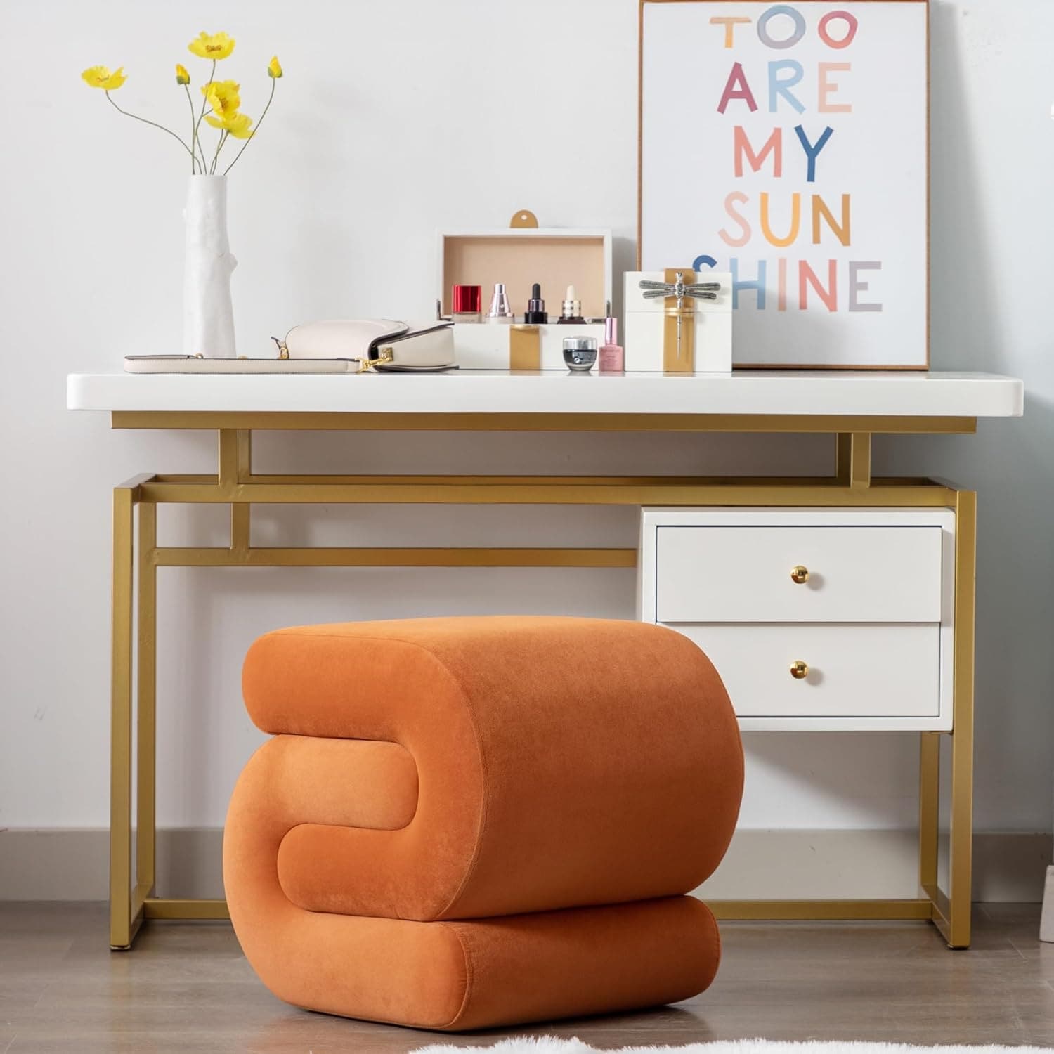 Velvet Upholstered Ottoman, Soft Foot Stool, S-Shaped Pouf for Living Room, Bedroom, Makeup Area (Orange)