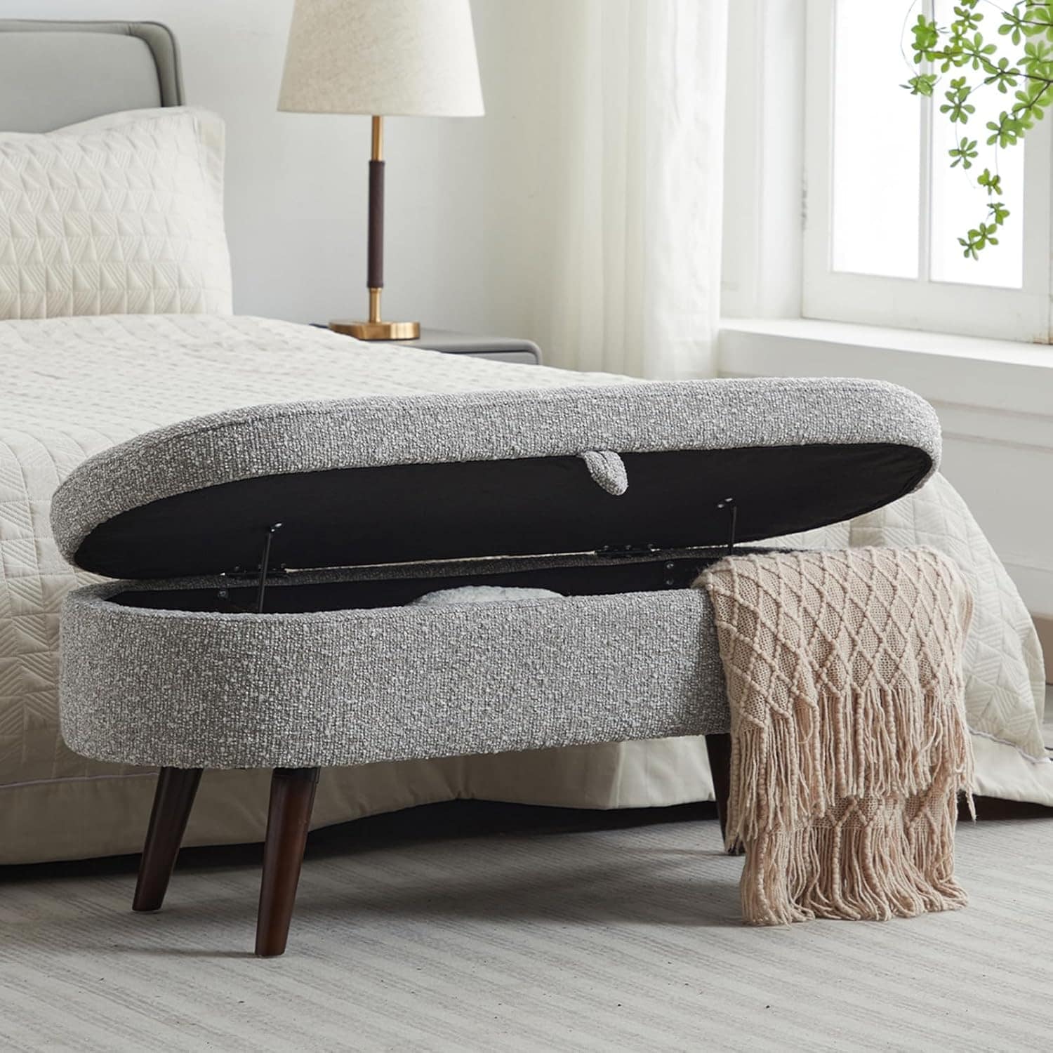 Oval Upholstered Storage Bench 43.8" with Safety Hinge and Solid Wood Legs, Gray