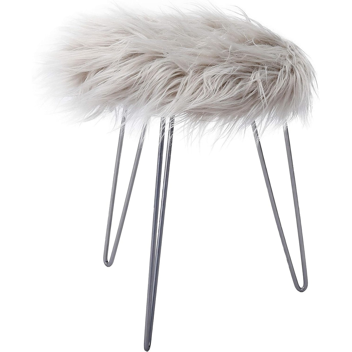Round Faux Fur Foot Stool - Soft Padded Seat with Metal Legs - Durable Wood Frame - Grey
