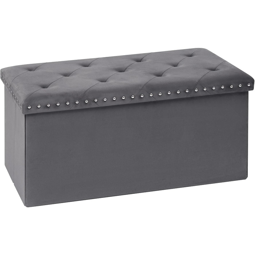Foldable Velvet Storage Ottoman Bench with Rivet Design, 30x15x15 Inches, Grey