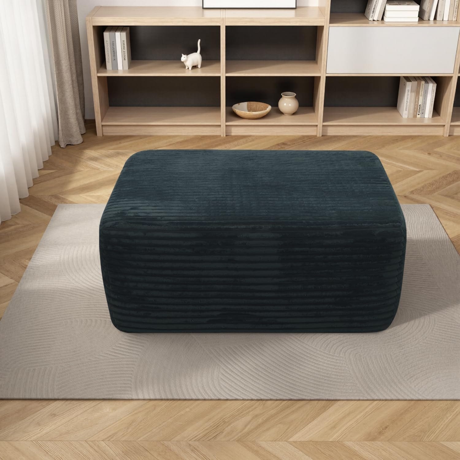 Oversized Ottoman Bench, Plush Corduroy Pouf Footrest, Fluffy Padded Seat Cube for Living Room - No Assembly (Black)