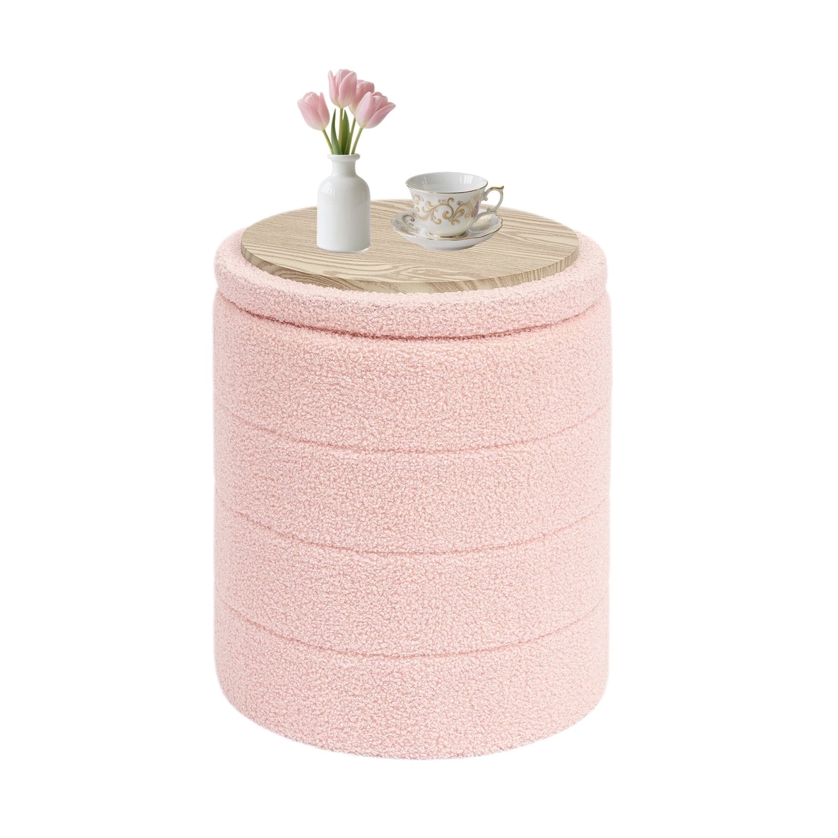 14.6-inch Collapsible Round Storage Ottoman with Tray - Pink Teddy Fabric Multi-Functional Footrest