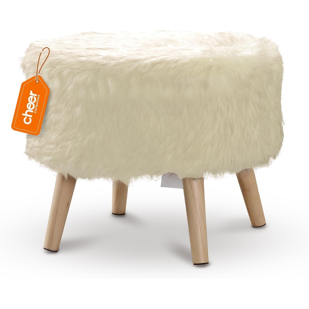 Round Ottoman Footstool - Plush Circle Foot Rest with Wooden Legs, Cozy Faux Fur Stool for Living Room Décor