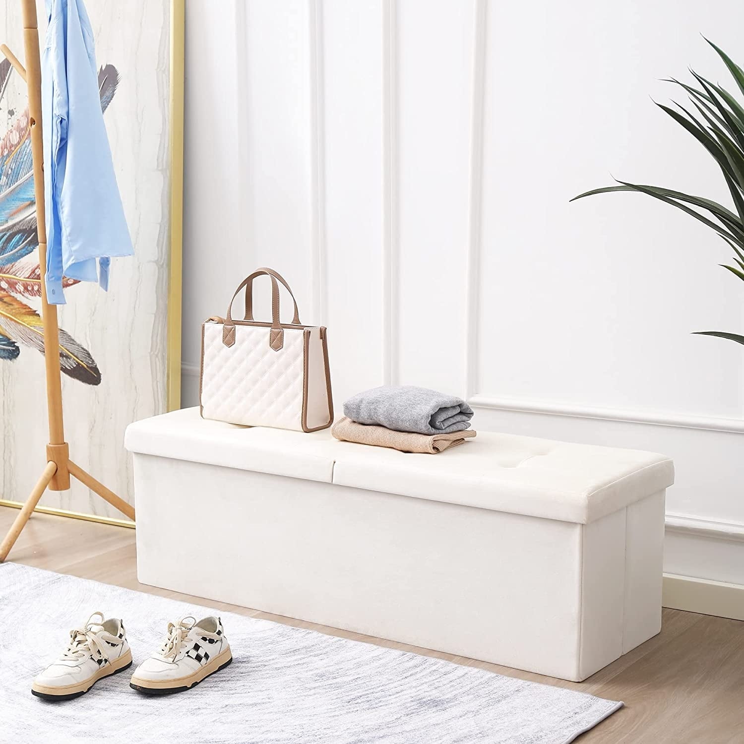 45.3-inch Foldable Storage Ottoman Bench with Flipping Lid, 166L Capacity, Cream Velvet Fabric