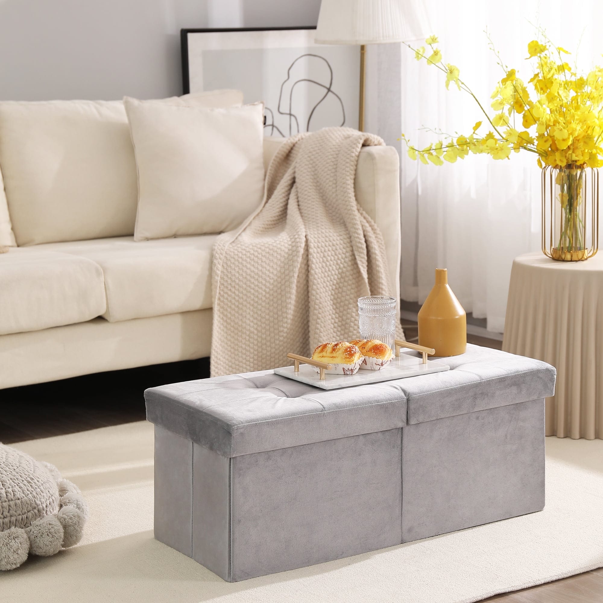 30-inch Velvet Grey Storage Ottoman Bench with Flipping Lid, 75L Capacity, Foldable Footrest for Bedroom Living Room