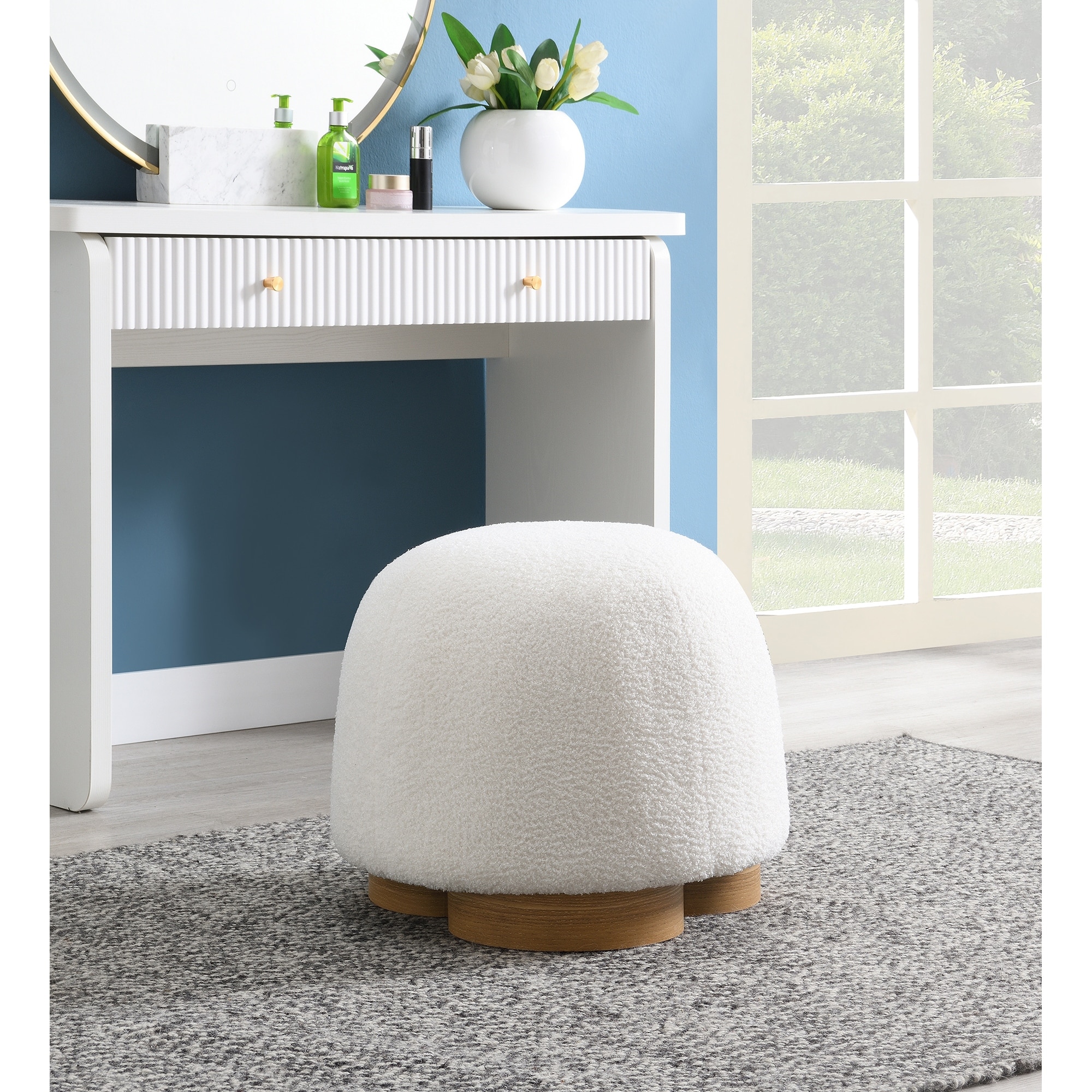 White Round Teddy Fabric Ottoman: Fully Assembled Footstool for Extra Seating