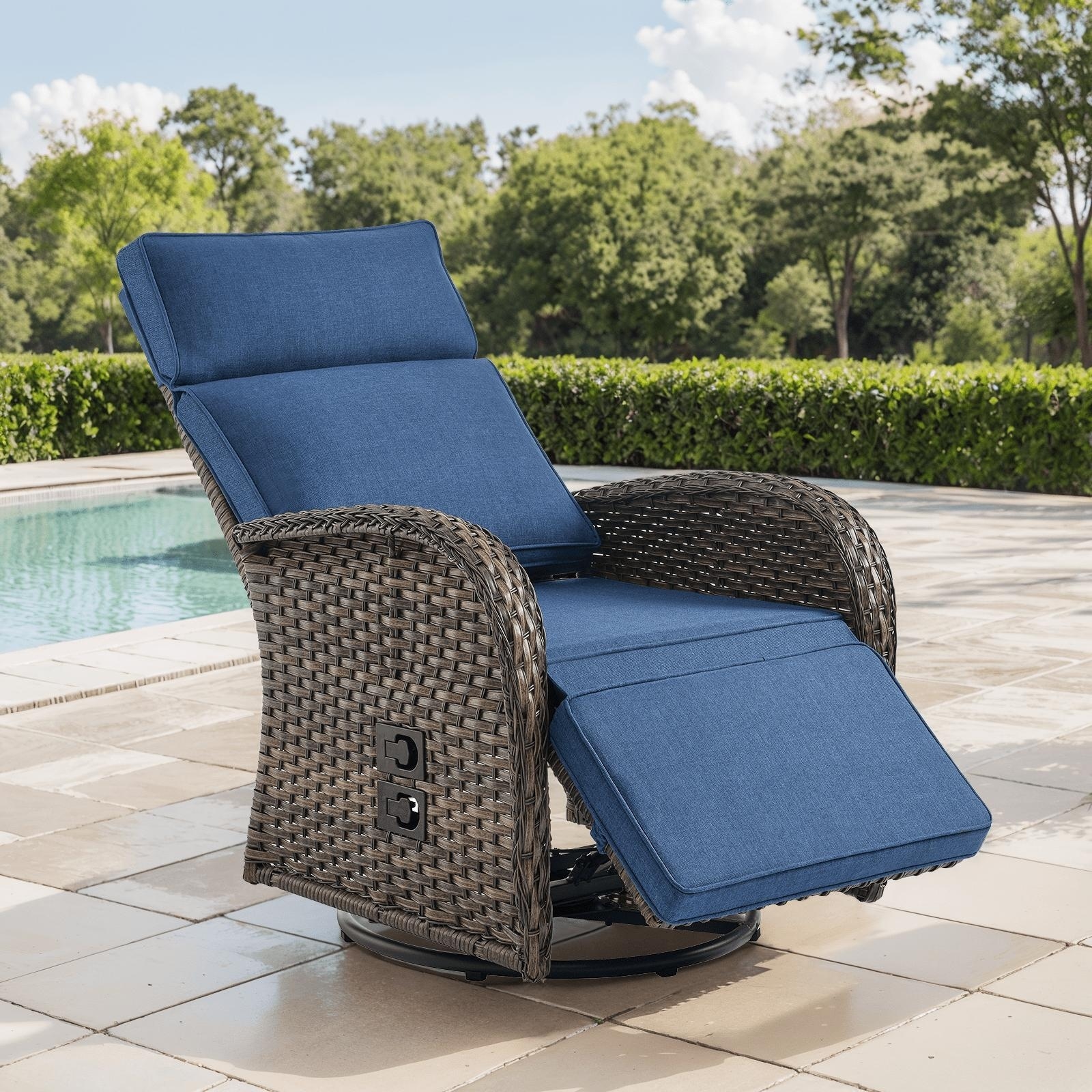 Pocassy Outdoor All-Weather Brown Wicker Chaise Lounge Chair Blue Cushion