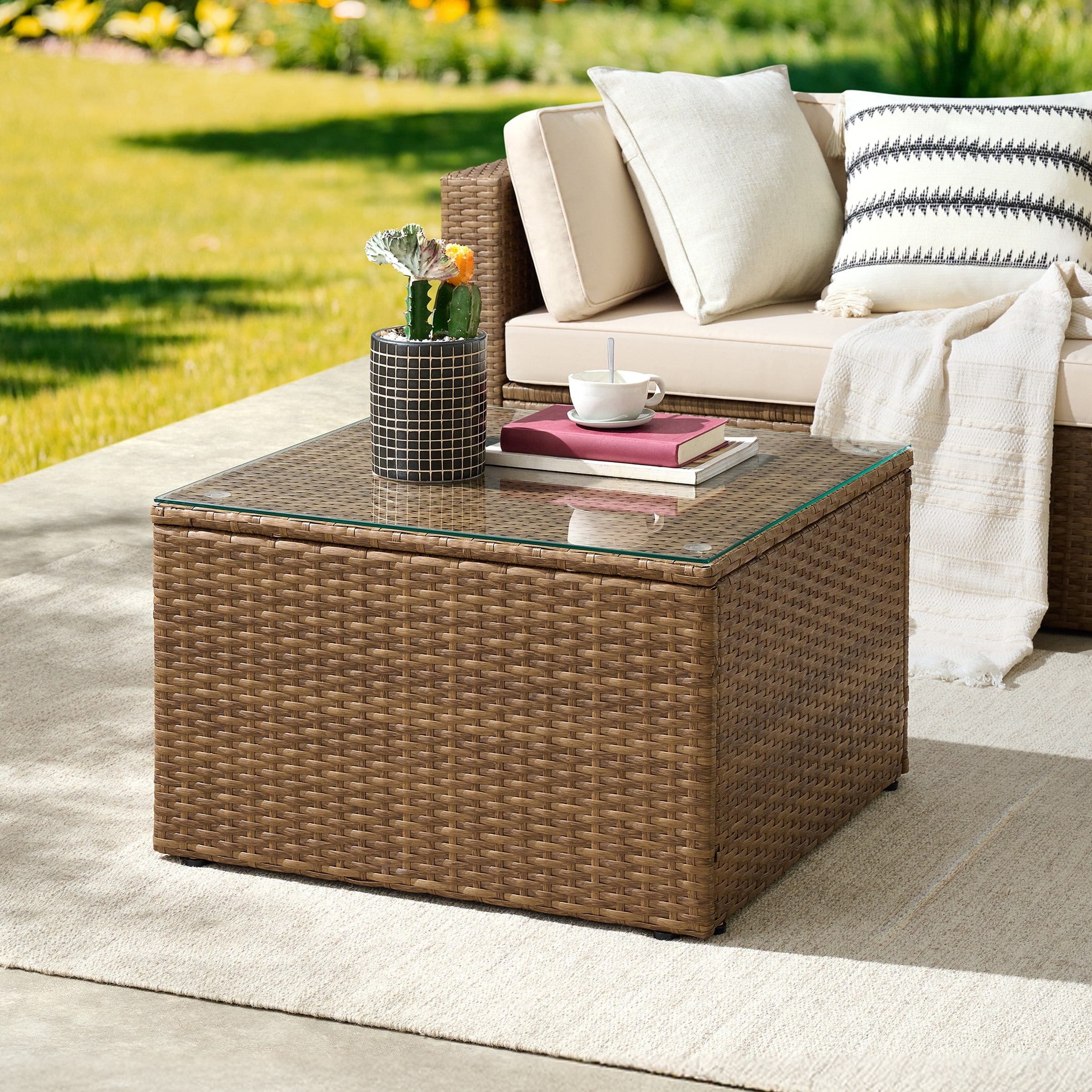 Alaterre Furniture Montara Wicker Outdoor Coffee Table 25.5" Square Weather-Resistant Small Patio Table with Tempered Glass Top